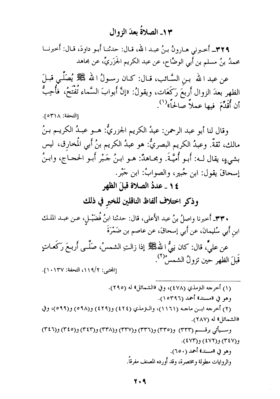 329 - أَخْبَرَنِي هَارُونُ بْنُ عَبْدِ اللهِ، قَالَ: حَدَّثَنَا أَبُو دَاوُدَ قَالَ: أَخْبَرَنَا مُحَمَّدُ بْنُ مُسْلِمِ بْنِ أَبِي الْوَضَّاحِ، عَنْ عَبْدِ الْكَرِيمِ الْجَزَرِيِّ، عَنْ مُجَاهِدٍ، عَنْ عَبْدِ اللهِ بْنِ السَّائِبِ، قَالَ: كَانَ رَسُولُ اللهِ صَلَّى اللهُ عَلَيْهِ وَسَلَّمَ " §يُصَلِّي قَبْلَ الظُّهْرِ بَعْدَ الزَّوَالِ أَرْبَعَ رَكَعَاتٍ، وَيَقُولُ: «إِنَّ أَبْوَابَ السَّمَاءِ تُفْتَحُ، فَأُحِبُّ أَنْ أُقَدِّمَ فِيهَا عَمَلًا صَالِحًا» وَقَالَ لَنَا: أَبُو عَبْدِ الرَّحْمَنِ: عَبْدُ الْكَرِيمِ الْجَزَرِيُّ، هُوَ عَبْدُ الْكَرِيمِ بْنُ مَالِكٍ، ثِقَةٌ، وَعَبْدُ الْكَرِيمِ الْبَصْرِيُّ، هُوَ عَبْدُ الْكَرِيمِ بْنُ أَبِي الْمُخَارِقِ، لَيْسَ بِشَيْءٍ، يُقَالُ لَهُ أَبُو أُمَيَّةَ، وَمُجَاهِدُ هو ابْنُ جَبْرٍ أَبُو الْحَجَّاجِ، وَابْنُ إِسْحَاقَ يَقُولُ: ابْنُ جُبَيْرٍ، وَالصَّوَابُ ابْنُ جَبْرٍ