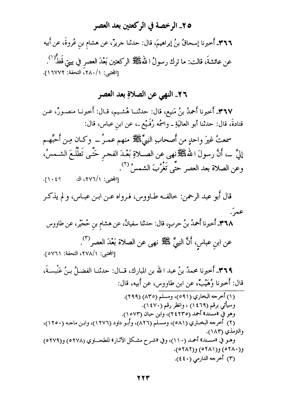 368 - أَخْبَرَنَا أَحْمَدُ بْنُ حَرْبٍ، قَالَ: حَدَّثَنَا سُفْيَانُ، عَنْ هِشَامِ بْنِ حُجَيْرٍ، عَنْ طَاوُسٍ، عَنِ ابْنِ عَبَّاسٍ، أَنَّ النَّبِيَّ صَلَّى اللهُ عَلَيْهِ وَسَلَّمَ «§نَهَى عَنِ الصَّلَاةِ بَعْدَ الْعَصْرِ»