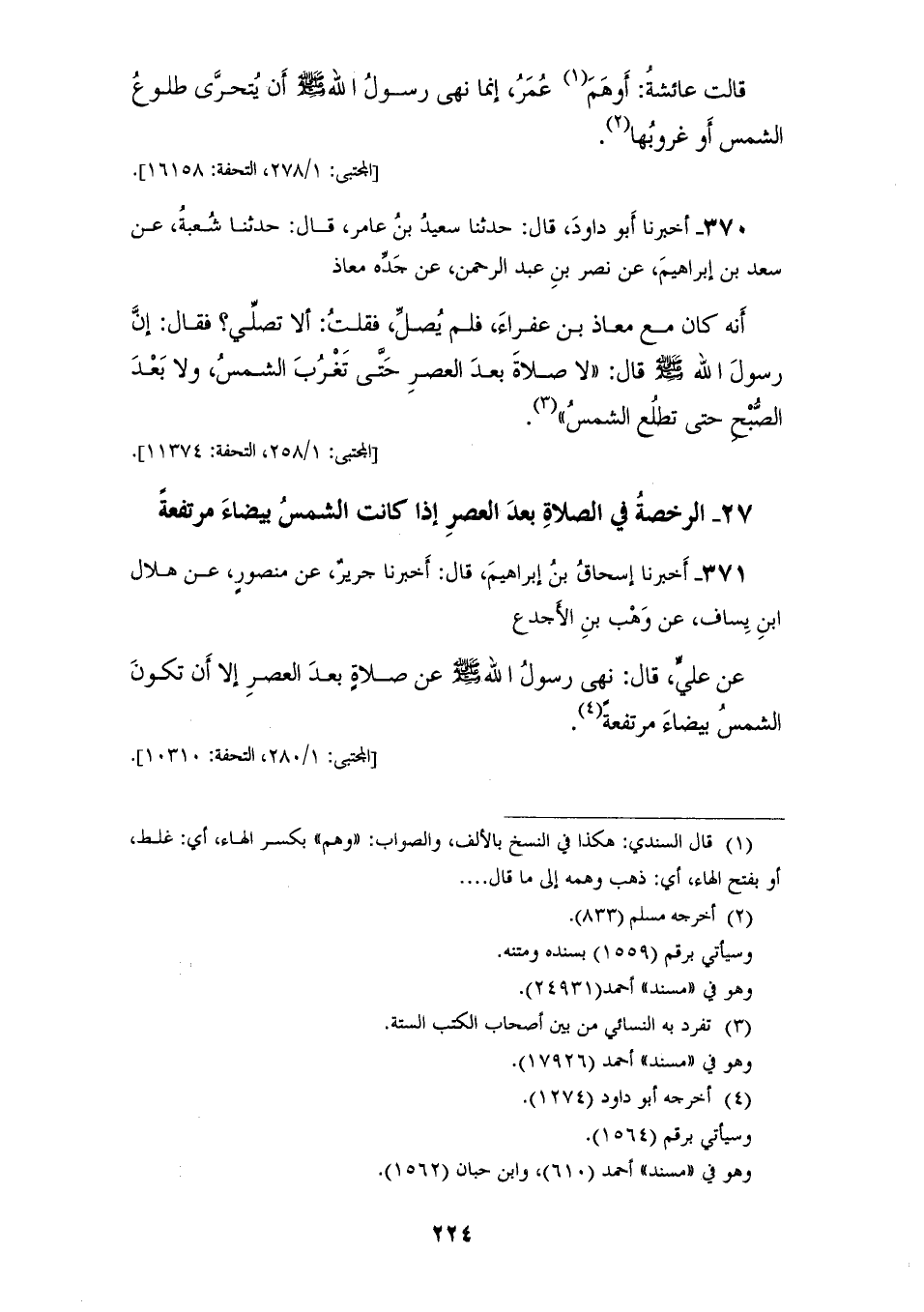 371 - أَخْبَرَنَا إِسْحَاقُ بْنُ إِبْرَاهِيمَ، قَالَ: أَخْبَرَنَا جَرِيرٌ، عَنْ مَنْصُورٍ، عَنْ هِلَالِ بْنِ يَسَافٍ، عَنْ وَهْبِ بْنِ الْأَجْدَعِ، عَنْ عَلِيٍّ، قَالَ: «§نَهَى رَسُولُ اللهِ صَلَّى اللهُ عَلَيْهِ وَسَلَّمَ، عَنْ صَلَاةٍ بَعْدَ الْعَصْرِ إِلَّا أَنْ تَكُونَ الشَّمْسُ بَيْضَاءَ مُرْتَفِعَةً»