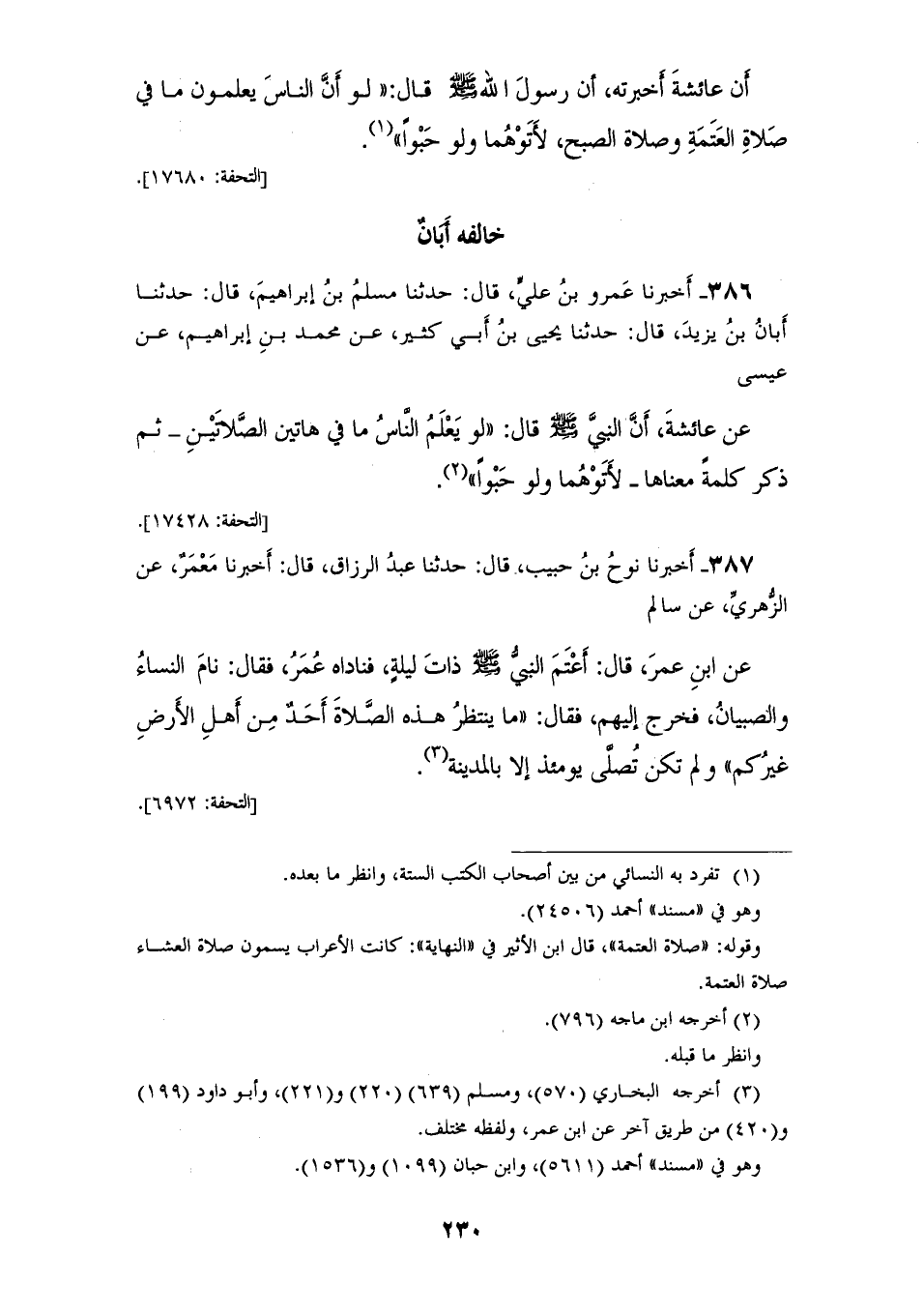 386 - أَخْبَرَنَا عَمْرُو بْنُ عَلِيٍّ، قَالَ: حَدَّثَنَا مُسْلِمُ بْنُ إِبْرَاهِيمَ، قَالَ: حَدَّثَنَا أَبَانُ بْنُ يَزِيدَ، قَالَ: حَدَّثَنَا يَحْيَى بْنُ أَبِي كَثِيرٍ، عَنْ مُحَمَّدِ بْنِ إِبْرَاهِيمَ، عَنْ عِيسَى، عَنْ عَائِشَةَ، أَنَّ النَّبِيَّ صَلَّى اللهُ عَلَيْهِ وَسَلَّمَ، قَالَ: «§لَوْ يُعَلِّمُ النَّاسَ مَا فِي هَاتَيْنِ الصَّلَاتَيْنِ» ثُمَّ ذَكَرَ كَلِمَةً مَعْنَاهَا «لَأَتَوْهُمَا وَلَوْ حَبْوًا»