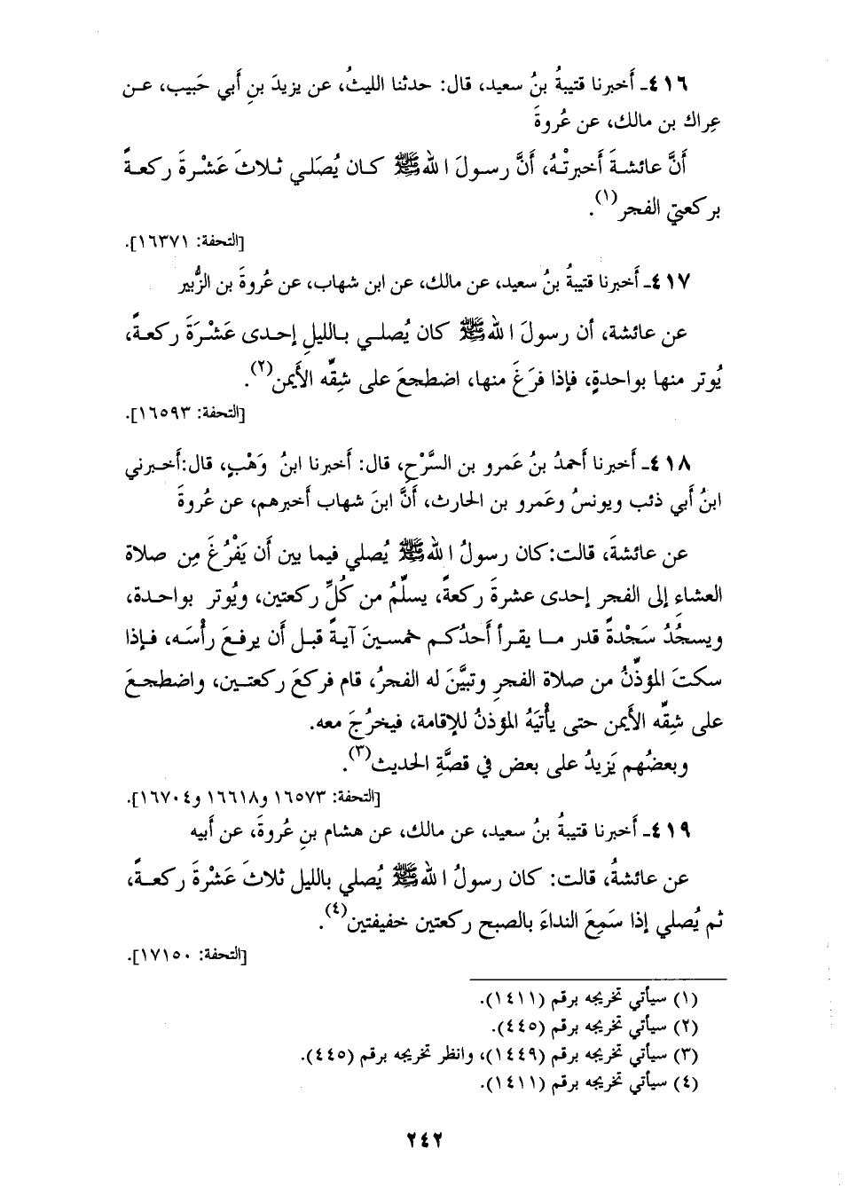 417 - أَخْبَرَنَا قُتَيْبَةُ بْنُ سَعِيدٍ، عَنْ مَالِكٍ، عَنِ ابْنِ شِهَابٍ، عَنْ عُرْوَةَ بْنِ الزُّبَيْرِ، عَنْ عَائِشَةَ، أَنَّ رَسُولَ اللهِ صَلَّى اللهُ عَلَيْهِ وَسَلَّمَ كَانَ «§يُصَلِّي بِاللَّيْلِ إِحْدَى عَشْرَةَ رَكْعَةً، يُوتِرُ مِنْهَا بِوَاحِدَةٍ، فَإِذَا فَرَغَ مِنْهَا اضْطَجَعَ عَلَى شِقِّهِ الْأَيْمَنَ»