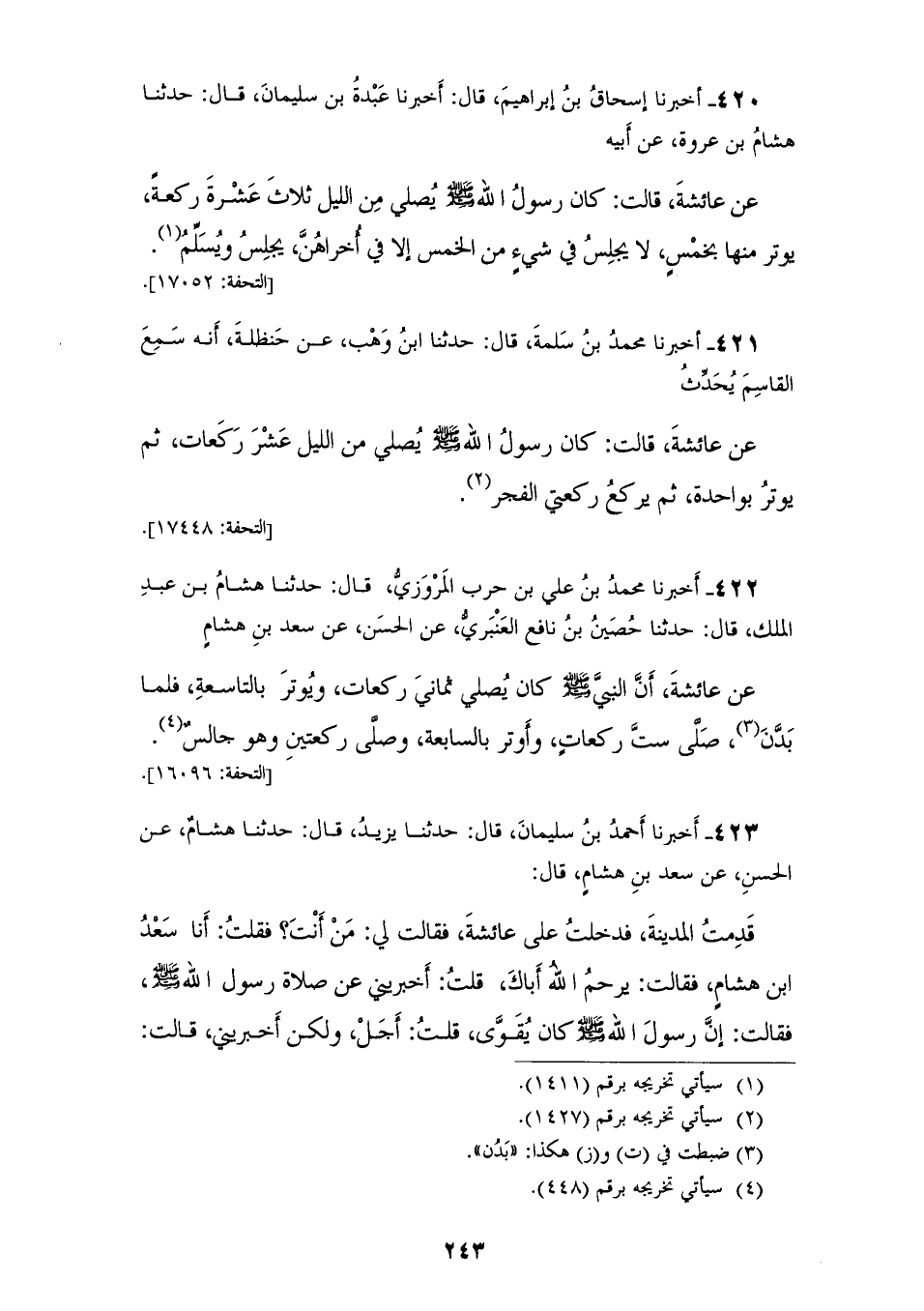 422 - أَخْبَرَنَا مُحَمَّدُ بْنُ عَلِيِّ بْنِ حَرْبٍ الْمَرْوَزِيُّ، قَالَ: حَدَّثَنَا هِشَامُ بْنُ عَبْدِ الْمَلِكِ، قَالَ: حَدَّثَنَا حُصَيْنُ بْنُ نَافِعٍ الْعَنْبَرِيُّ، عَنِ الْحَسَنِ، عَنْ سَعْدِ بْنِ هِشَامٍ، عَنْ عَائِشَةَ، أَنَّ النَّبِيَّ صَلَّى اللهُ عَلَيْهِ وَسَلَّمَ كَانَ «§يُصَلِّي ثَمَانِيَ رَكَعَاتٍ، وَيُوتِرُ بِالتَّاسِعَةِ، فَلَمَّا بَدُنَ صَلَّى سِتَّ رَكَعَاتٍ، وَأَوْتَرَ بِالسَّابِعَةِ، وَصَلَّى رَكْعَتَيْنِ، وَهُوَ جَالِسٌ»