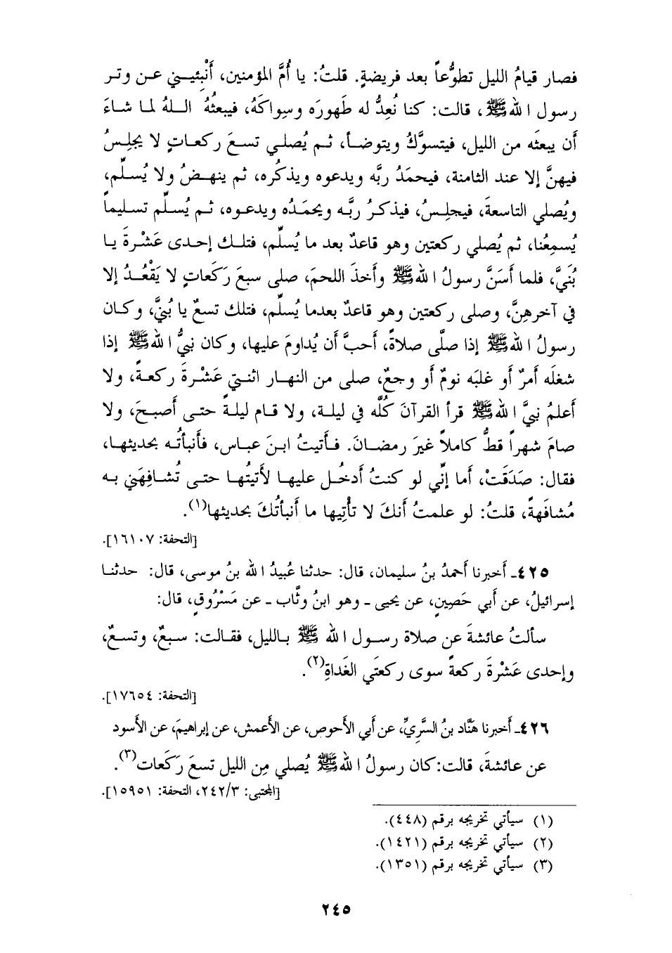 425 - أَخْبَرَنَا أَحْمَدُ بْنُ سُلَيْمَانَ، قَالَ: حَدَّثَنَا عُبَيْدُ اللهِ بْنُ مُوسَى، قَالَ: حَدَّثَنَا إِسْرَائِيلُ، عَنْ أَبِي حُصَيْنٍ، عَنْ يَحْيَى وَهُوَ ابْنُ وَثَّابٍ، عَنْ مَسْرُوقٍ، قَالَ: سَأَلْتُ عَائِشَةَ عَنْ صَلَاةِ رَسُولِ اللهِ صَلَّى اللهُ عَلَيْهِ وَسَلَّمَ بِاللَّيْلِ؟ فَقَالَتْ: «§سَبْعٌ وَتِسْعٌ وَإِحْدَى عَشْرَةَ رَكْعَةً سِوَى رَكْعَتَيِ الْغَدَاةِ»