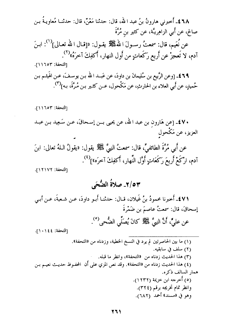 468 - أَخْبَرَنِي هَارُونُ بْنُ عَبْدِ اللهِ، قَالَ: حَدَّثَنَا مَعْنٌ، قَالَ: حَدَّثَنَا مُعَاوِيَةُ بْنُ صَالِحٍ، عَنْ أَبِي الزَّاهِرِيَّةِ، عَنْ كَثِيرِ بْنِ مُرَّةَ، عَنْ نُعَيْمٍ، قَالَ: سَمِعْتُ رَسُولَ اللهِ صَلَّى اللهُ عَلَيْهِ وَسَلَّمَ، يَقُولُ: قَالَ اللهُ تَعَالَى: «§ابْنَ آدَمَ لَا تَعْجِزْ عَنْ أَرْبَعِ رَكَعَاتٍ مِنْ أَوَّلِ النَّهَارِ أَكْفِكَ آخِرَهُ»