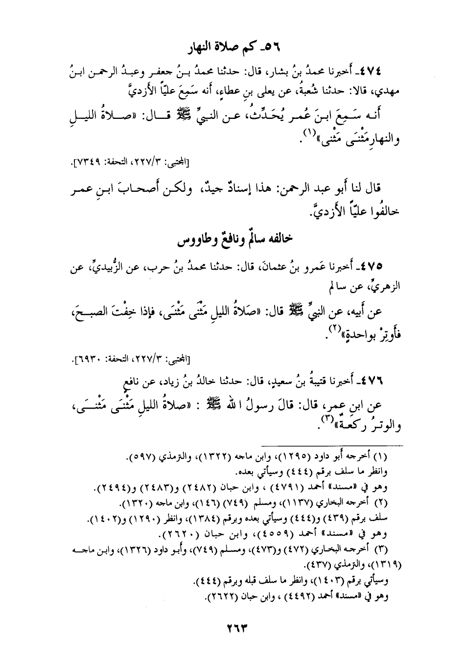 474 - أَخْبَرَنَا مُحَمَّدُ بْنُ بَشَّارٍ، قَالَ: حَدَّثَنَا مُحَمَّدُ بْنُ جَعْفَرٍ، وَعَبْدُ الرَّحْمَنِ بْنُ مَهْدِيٍّ، قَالَا: حَدَّثَنَا شُعْبَةُ، عَنْ يَعْلَى بْنِ عَطَاءَ، أَنَّهُ سَمِعَ عَلِيًّا الْأَزْدِيَّ، أَنَّهُ سَمِعَ ابْنَ عُمَرَ، يُحَدِّثُ، عَنِ النَّبِيِّ صَلَّى اللهُ عَلَيْهِ وَسَلَّمَ، قَالَ: «§صَلَاةُ اللَّيْلِ وَالنَّهَارِ مَثْنَى مَثْنَى» قَالَ لَنَا أَبُو عَبْدِ الرَّحْمَنِ: هَذَا إِسْنَادٌ جَيِّدٌ، وَلَكِنَّ أَصْحَابَ ابْنِ عُمَرَ خَالِفُوا عَلِيًّا الْأَزْدِيَّ خَالَفَهُ سَالِمٌ وَنَافِعٌ وَطَاوُسٌ