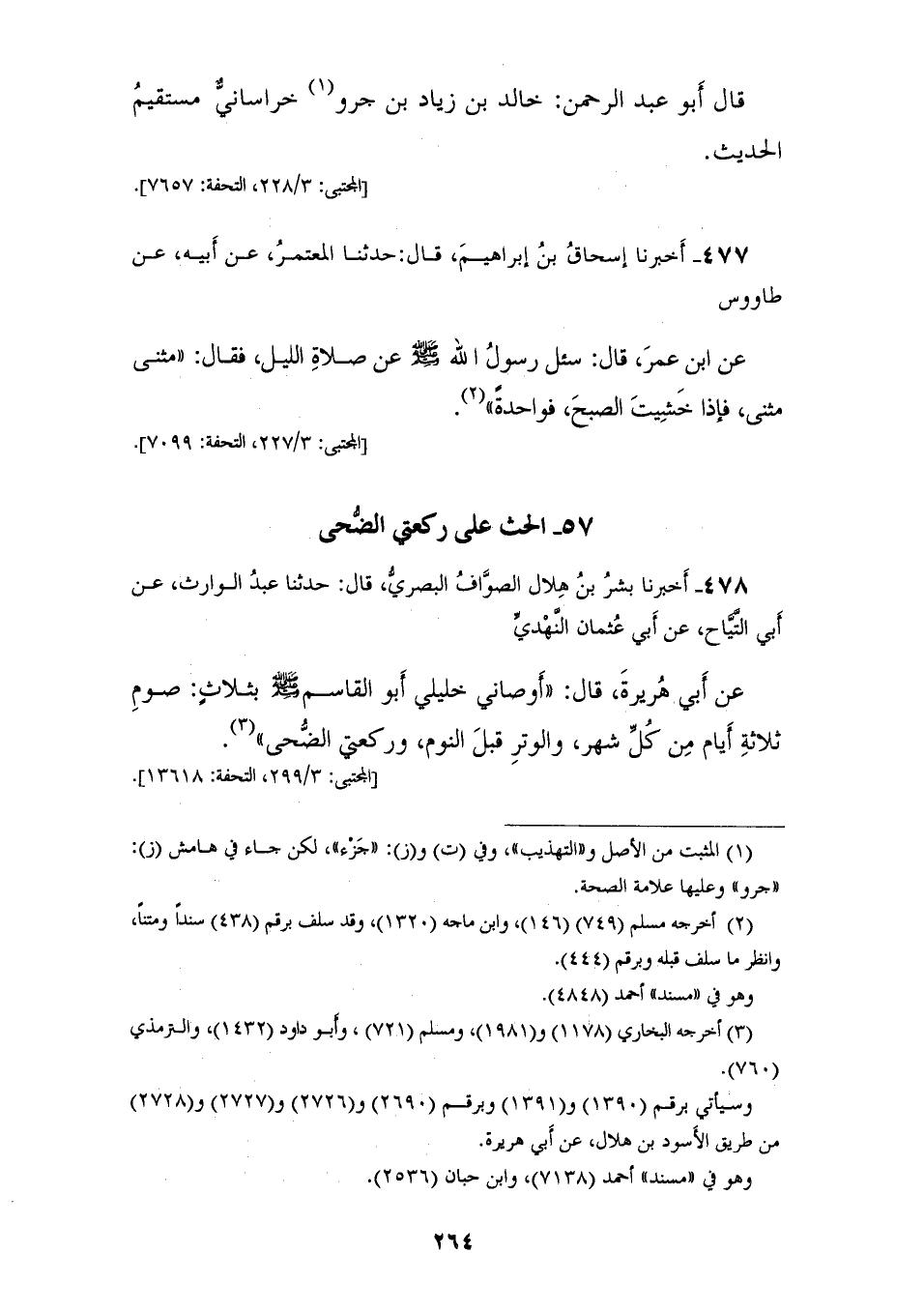 478 - أَخْبَرَنَا بِشْرُ بْنُ هِلَالٍ الصَّوَّافُ الْبَصْرِيُّ، قَالَ: حَدَّثَنَا عَبْدُ الْوَارِثِ، عَنْ أَبِي التَّيَّاحِ، عَنْ أَبِي عُثْمَانَ النَّهْدِيِّ، عَنْ أَبِي هُرَيْرَةَ، قَالَ: أَوْصَانِي خَلِيلِي أَبُو الْقَاسِمِ صَلَّى اللهُ عَلَيْهِ وَسَلَّمَ، بِثَلَاثٍ: «§صَوْمِ ثَلَاثَةِ أَيَّامٍ مِنْ كُلِّ شَهْرٍ، وَالْوِتْرِ قَبْلَ النَّوْمِ، وَرَكْعَتَيِ الضُّحَى»