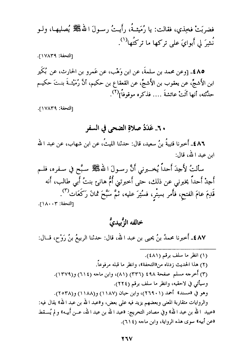 486 - أَخْبَرَنَا قُتَيْبَةُ بْنُ سَعِيدٍ، قَالَ: حَدَّثَنَا اللَّيْثُ، عَنِ ابْنِ شِهَابٍ، عَنْ عَبْدِ اللهِ بْنِ عَبْدِ اللهِ، قَالَ: سَأَلْتُ لَأَجِدَ أَحَدًا يُخْبِرُنِِي أَنَّ رَسُولَ اللهِ صَلَّى اللهُ عَلَيْهِ وَسَلَّمَ " §سَبَّحَ فِي سَفَرِهِ فَلَمْ أَجِدْ أَحَدًا يُخْبِرُنِي عَنْ ذَلِكَ، حَتَّى أَخْبَرَتْنِي أُمُّ هَانِئٍ بِنْتُ أَبِي طَالِبٍ أَنَّهُ: قَدِمَ عَامَ الْفَتْحِ فَأَمَرَ بِسِتْرٍ فَسُتِرَ عَلَيْهِ، ثُمَّ سَبَّحَ ثَمَانِ رَكَعَاتٍ " خَالَفَهُ الزُّبَيْدِيُّ