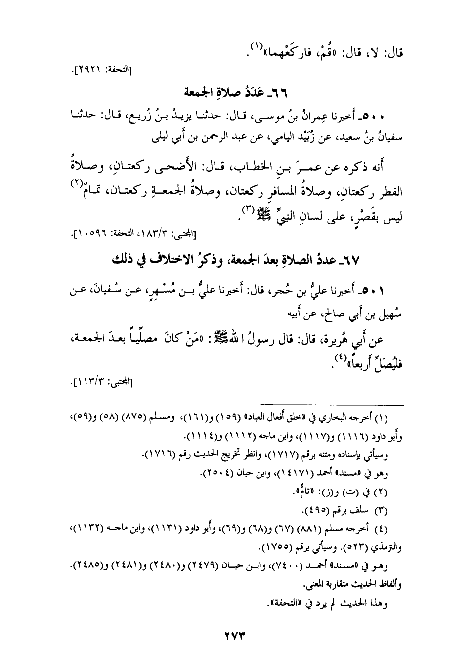 501 - أَخْبَرَنَا عَلِيُّ بْنُ حُجْرٍ، قَالَ: أَخْبَرَنَا عَلِيُّ بْنُ مُسْهِرٍ، عَنْ سُفْيَانَ، عَنْ سُهَيْلِ بْنِ أَبِي صَالِحٍ، عَنْ أَبِيهِ، عَنْ أَبِي هُرَيْرَةَ، قَالَ: قَالَ رَسُولُ اللهِ صَلَّى اللهُ عَلَيْهِ وَسَلَّمَ: «§مَنْ كَانَ مُصَلِّيًا بَعْدَ الْجُمُعَةِ فَلْيُصَلِّ أَرْبَعًا»
