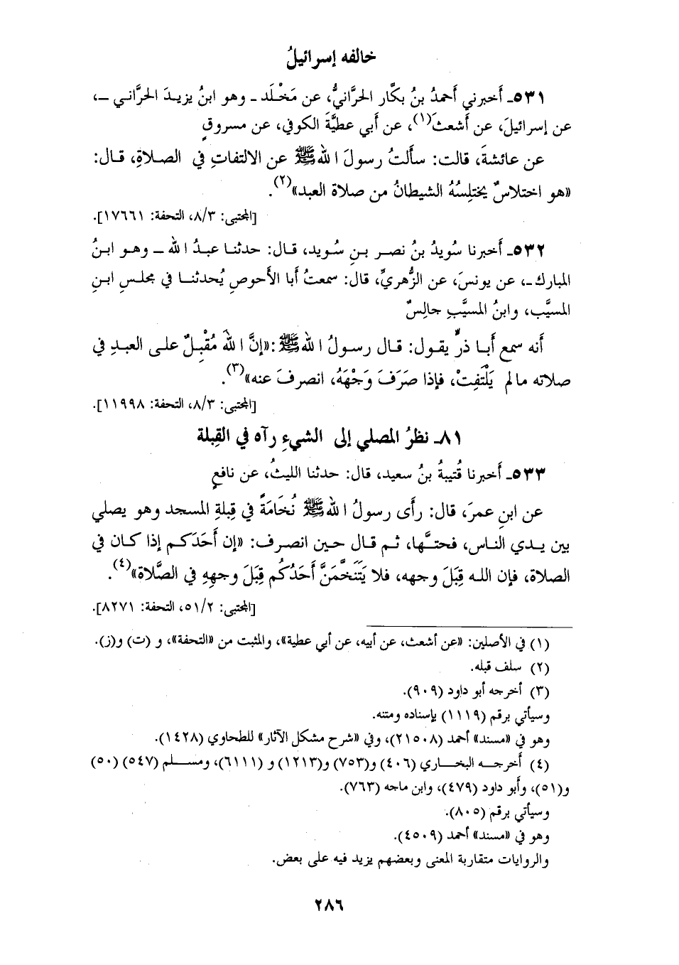 531 - أَخْبَرَنِي أَحْمَدُ بْنُ بَكَّارٍ الْحَرَّانِيُّ، عَنْ مَخْلَدٍ وَهُوَ ابْنُ يَزِيدَ الْحَرَّانِيُّ، عَنْ إِسْرَائِيلَ، عَنْ أَشْعَثَ، عَنْ أَبِي عَطِيَّةَ الْكُوفِيِّ، عَنْ مَسْرُوقٍ، عَنْ عَائِشَةَ قَالَتْ: سَأَلْتُ رَسُولَ اللهِ صَلَّى اللهُ عَلَيْهِ وَسَلَّمَ، عَنِ الِالْتِفَاتِ فِي الصَّلَاةِ قَالَ: «§هُوَ اخْتِلَاسٌ يَخْتَلِسُهُ الشَّيْطَانُ مِنْ صَلَاةِ الْعَبْدِ»