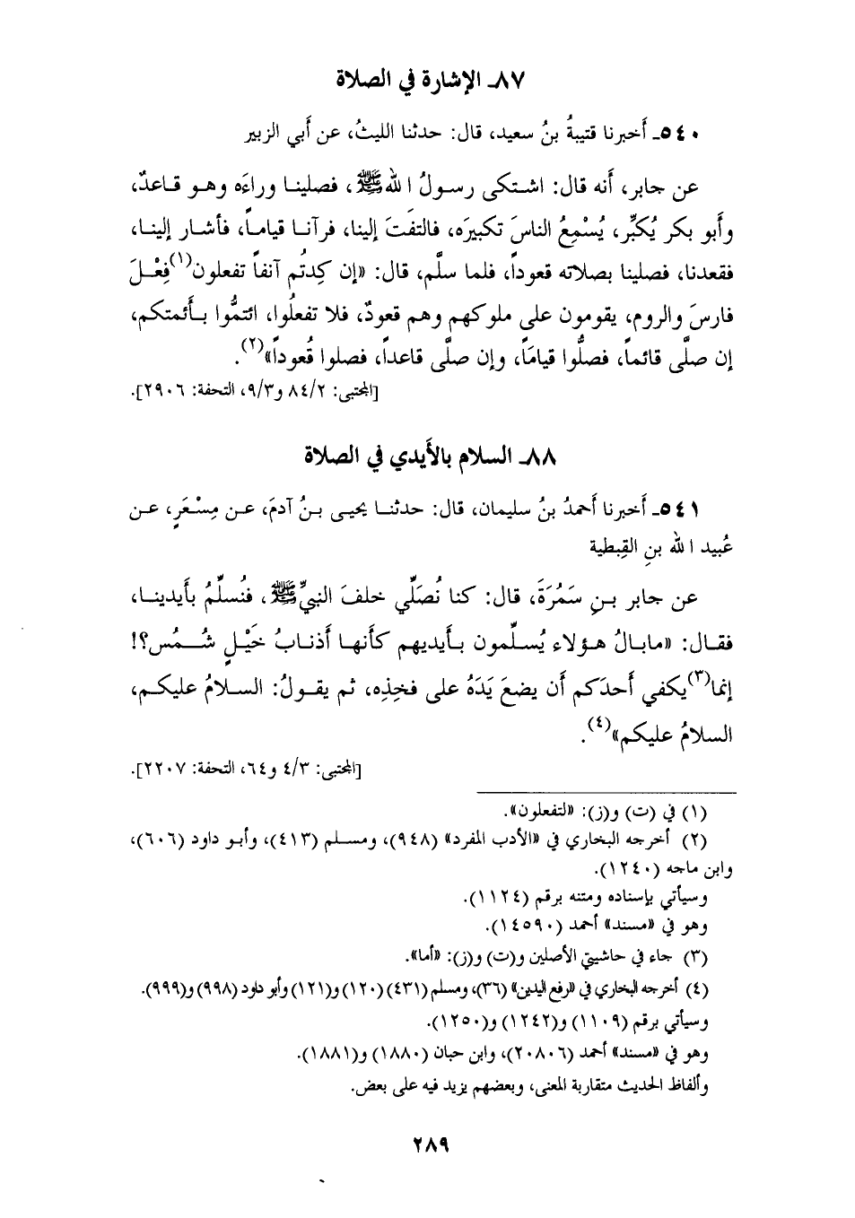 541 - أَخْبَرَنَا أَحْمَدُ بْنُ سُلَيْمَانَ قَالَ: حَدَّثَنَا يَحْيَى بْنُ آدَمَ، عَنْ مِسْعَرٍ، عَنْ عُبَيْدِ اللهِ بْنِ الْقِبْطِيَّةِ، عَنْ جَابِرِ بْنِ سَمُرَةَ قَالَ: كُنَّا نُصَلِّي خَلْفَ النَّبِيَّ صَلَّى اللهُ عَلَيْهِ وَسَلَّمَ، فَنُسَلِّمُ بِأَيْدِينَا، فَقَالَ: " §مَا بَالُ هَؤُلَاءِ يُسَلِّمُونَ بِأَيْدِيهِمْ كَأَنَّهَا أَذْنَابُ خَيْلِ شَمْسٍ، إِنَّمَا يَكْفِي أَحَدَكُمْ أَنْ يَضَعَ يَدَهُ عَلَى فَخِذِهِ ثُمَّ يَقُولُ: السَّلَامُ عَلَيْكُمُ السَّلَامُ عَلَيْكُمْ "