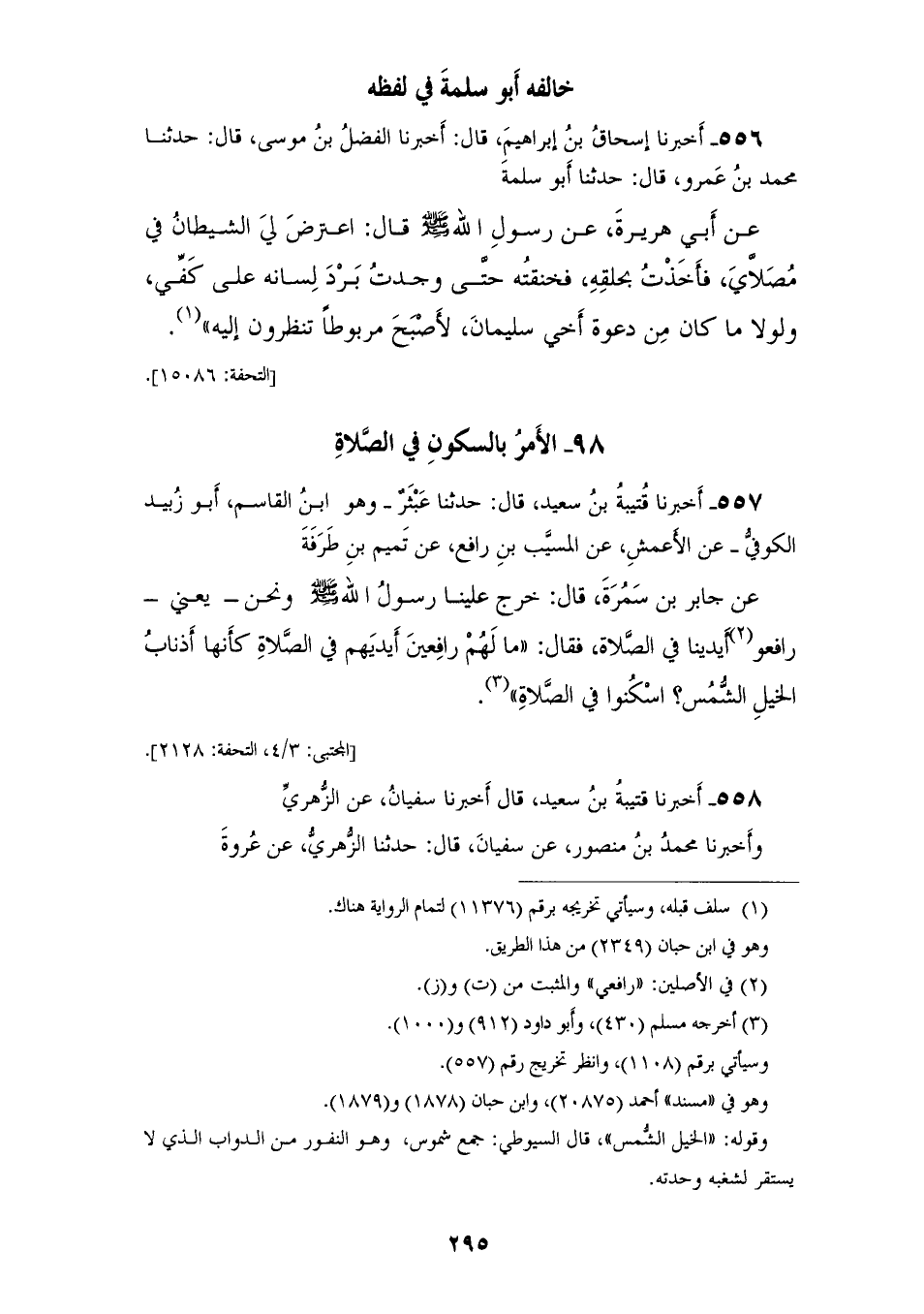 556 - أَخْبَرَنَا إِسْحَاقُ بْنُ إِبْرَاهِيمَ قَالَ: أَخْبَرَنَا الْفَضْلُ بْنُ مُوسَى قَالَ: حَدَّثَنَا مُحَمَّدُ بْنُ عَمْرٍو قَالَ: حَدَّثَنَا أَبُو سَلَمَةُ، عَنْ أَبِي هُرَيْرَةَ، عَنْ رَسُولِ اللهِ صَلَّى اللهُ عَلَيْهِ وَسَلَّمَ قَالَ: «§اعْتَرَضَ لِي الشَّيْطَانُ فِي مُصَلَّايَ فَأَخَذْتُ بِحَلْقِهِ فَخَنَقْتُهُ، حَتَّى وَجَدْتُ بَرْدَ لِسَانِهِ عَلَى كَفَّيَّ، وَلَوْلَا مَا كَانَ مِنْ دَعْوَةِ أَخِي سُلَيْمَانَ، لَأَصْبَحَ مَرْبُوطًا تَنْظُرُونَ إِلَيْهِ»