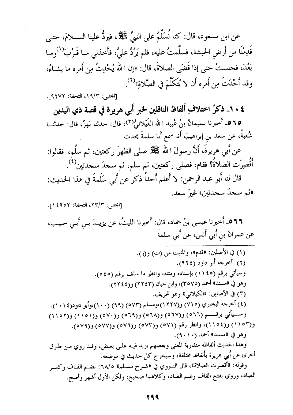 566 - أَخْبَرَنَا عِيسَى بْنُ حَمَّادٍ قَالَ: أَخْبَرَنَا اللَّيْثُ، عَنْ يَزِيدَ بْنِ أَبِي حَبِيبٍ، عَنْ عِمْرَانَ بْنِ أَبِي أَنَسٍ، عَنْ أَبِي سَلَمَةَ، عَنْ أَبِي هُرَيْرَةَ أَنَّ رَسُولَ اللهِ صَلَّى اللهُ عَلَيْهِ وَسَلَّمَ صَلَّى يَوْمًا فَسَلَّمَ فِي رَكْعَتَيْنِ، ثُمَّ انْصَرَفَ فَأَدْرَكَهُ ذُو الشِّمَالَيْنِ فَقَالَ: يَا رَسُولَ اللهِ، أَنَقَصَتْ أَمْ نَسِيتَ؟ فَقَالَ: «§لَمْ تَنْقُصِ الصَّلَاةُ، وَلَمْ أَنَسَ»، قَالَ: بَلَى، وَالَّذِي بَعَثَكَ بِالْحَقِّ، قَالَ رَسُولُ اللهِ صَلَّى اللهُ عَلَيْهِ وَسَلَّمَ: «أَصَدَقَ ذُو الْيَدَيْنِ؟»، قَالُوا نَعَمْ، فَصَلَّى بِالنَّاسِ رَكْعَتَيْنِ