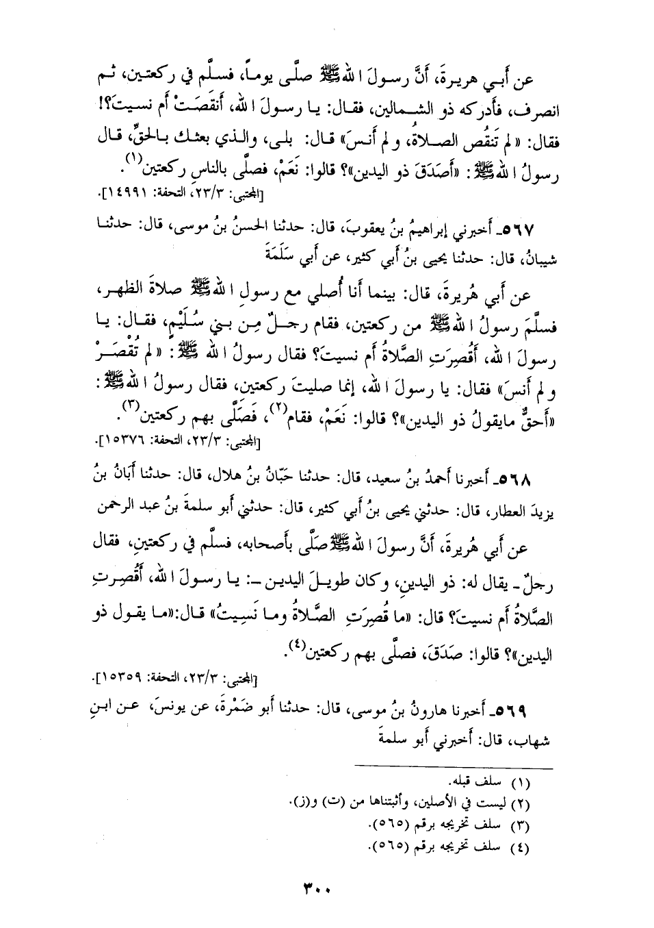 568 - أَخْبَرَنَا أَحْمَدُ بْنُ سَعِيدٍ قَالَ: حَدَّثَنَا حَبَّانُ بْنُ هِلَالٍ قَالَ: حَدَّثَنَا أَبَانُ بْنُ يَزِيدَ الْعَطَّارُ قَالَ: حَدَّثَنِي يَحْيَى بْنُ أَبِي كَثِيرٍ قَالَ: حَدَّثَنِي أَبُو سَلَمَةَ بْنُ عَبْدِ الرَّحْمَنِ عَنْ أَبِي هُرَيْرَةَ أَنَّ رَسُولَ اللهِ صَلَّى اللهُ عَلَيْهِ وَسَلَّمَ صَلَّى بِأَصْحَابِهِ فَسَلَّمَ فِي رَكْعَتَيْنِ، فَقَالَ رَجُلٌ يُقَالُ لَهُ ذُو الْيَدَيْنِ وَكَانَ طَوِيلَ الْيَدَيْنِ: يَا رَسُولَ اللهِ أَقَصُرَتِ الصَّلَاةُ أَمْ نَسِيتَ؟، قَالَ: «§مَا قَصُرَتِ الصَّلَاةُ وَمَا نَسِيتُ»، قَالَ: مَا يَقُولُ ذُو الْيَدَيْنِ؟، قَالُوا صَدَقَ. فَصَلَّى بِهِمْ رَكْعَتَيْنِ
