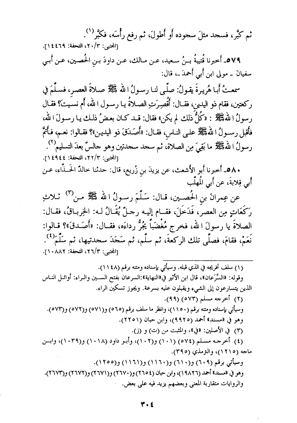 580 - أَخْبَرَنَا أَبُو الْأَشْعَثِ، عَنْ يَزِيدَ بْنِ زُرَيْعٍ قَالَ: حَدَّثَنَا خَالِدٌ الْحَذَّاءُ، عَنْ أَبِي قِلَابَةَ، عَنْ أَبِي الْمُهَلَّبِ، عَنْ عِمْرَانَ بْنِ الْحُصَيْنِ قَالَ: سَلَّمَ رَسُولُ اللهِ صَلَّى اللهُ عَلَيْهِ وَسَلَّمَ مِنْ ثَلَاثِ رَكَعَاتٍ مِنَ الْعَصْرِ فَدَخَلَ فَقَامَ إِلَيْهِ رَجُلٌ يُقَالُ لَهُ: الْخِرْبَاقُ، فَقَالَ: الصَّلَاةُ يَا رَسُولَ اللهِ فَخَرَجَ مُغْضِبًا يَجُرُّ رِدَاءَهُ، فَقَالَ: «أَصَدَقَ؟» قَالُوا: نَعَمْ، §فَقَامَ فَصَلَّى تِلْكَ الرَّكْعَةَ، ثُمَّ سَلَّمَ ثُمَّ سَجَدَ سَجْدَتَيْهَا ثُمَّ سَلَّمَ