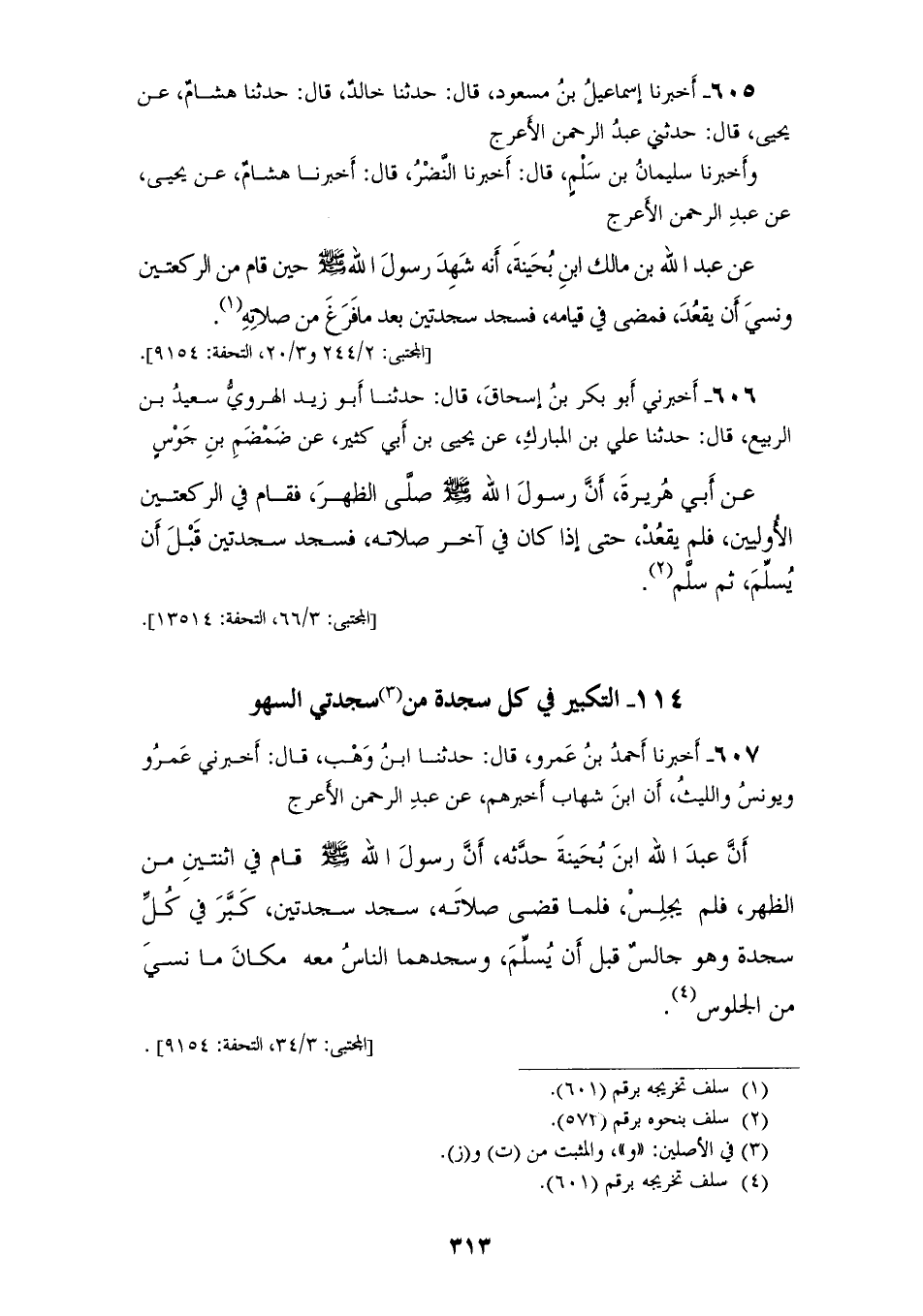 605 - أَخْبَرَنَا إِسْمَاعِيلُ بْنُ مَسْعُودٍ قَالَ: حَدَّثَنَا خَالِدٌ قَالَ: حَدَّثَنَا هِشَامٌ، عَنْ يَحْيَى قَالَ: حَدَّثَنِي عَبْدُ الرَّحْمَنِ الْأَعْرَجُ، وَأَخْبَرَنَا سُلَيْمَانُ بْنُ سَلْمٍ قَالَ: أَخْبَرَنَا النَّضْرُ قَالَ: أَخْبَرَنَا هِشَامٌ، عَنْ يَحْيَى، عَنْ عَبْدِ الرَّحْمَنِ الْأَعْرَجِ، عَنْ عَبْدِ اللهِ بْنِ مَالِكِ بْنِ بُحَيْنَةَ، أَنَّهُ شَهِدَ رَسُولَ اللهِ صَلَّى اللهُ عَلَيْهِ وَسَلَّمَ حِينَ §قَامَ مِنَ الرَّكْعَتَيْنِ، وَنَسِيَ أَنْ يَقْعُدَ، فَمَضَى فِي قِيَامِهِ فَسَجَدَ سَجْدَتَيْنِ، بَعْدَمَا فَرَغَ مِنْ صَلَاتِهِ