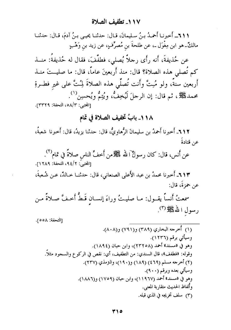 611 - أَخْبَرَنَا أَحْمَدُ بْنُ سُلَيْمَانَ قَالَ: حَدَّثَنَا يَحْيَى بْنُ آدَمَ قَالَ: حَدَّثَنَا مَالِكٌ، هُوَ ابْنُ مِغْوَلٍ، عَنْ طَلْحَةَ بْنِ مُصَرِّفٍ، عَنْ زَيْدِ بْنِ وَهْبٍ، عَنْ حُذَيْفَةَ، أَنَّهُ رَأَى رَجُلًا يُصَلِّي فَطَفَّفَ، فَقَالَ لَهُ حُذَيْفَةُ: «مُنْذُ كَمْ تُصَلِّي هَذِهِ الصَّلَاةَ؟»، قَالَ: مُنْذُ أَرْبَعِينَ عَامًا، قَالَ: «مَا صَلَّيْتَ مُنْذُ أَرْبَعِينَ سَنَةً، وَلَوْ مِتَّ وَأَنْتَ تُصَلِّي هَذِهِ الصَّلَاةَ لَمِتَّ عَلَى غَيْرِ فِطْرَةِ مُحَمَّدٍ صَلَّى اللهُ عَلَيْهِ وَسَلَّمَ» ثُمَّ قَالَ: «إِنَّ §الرَّجُلَ لَيُخِفُّ، وَيُتِمُّ وَيُحْسِنُ»