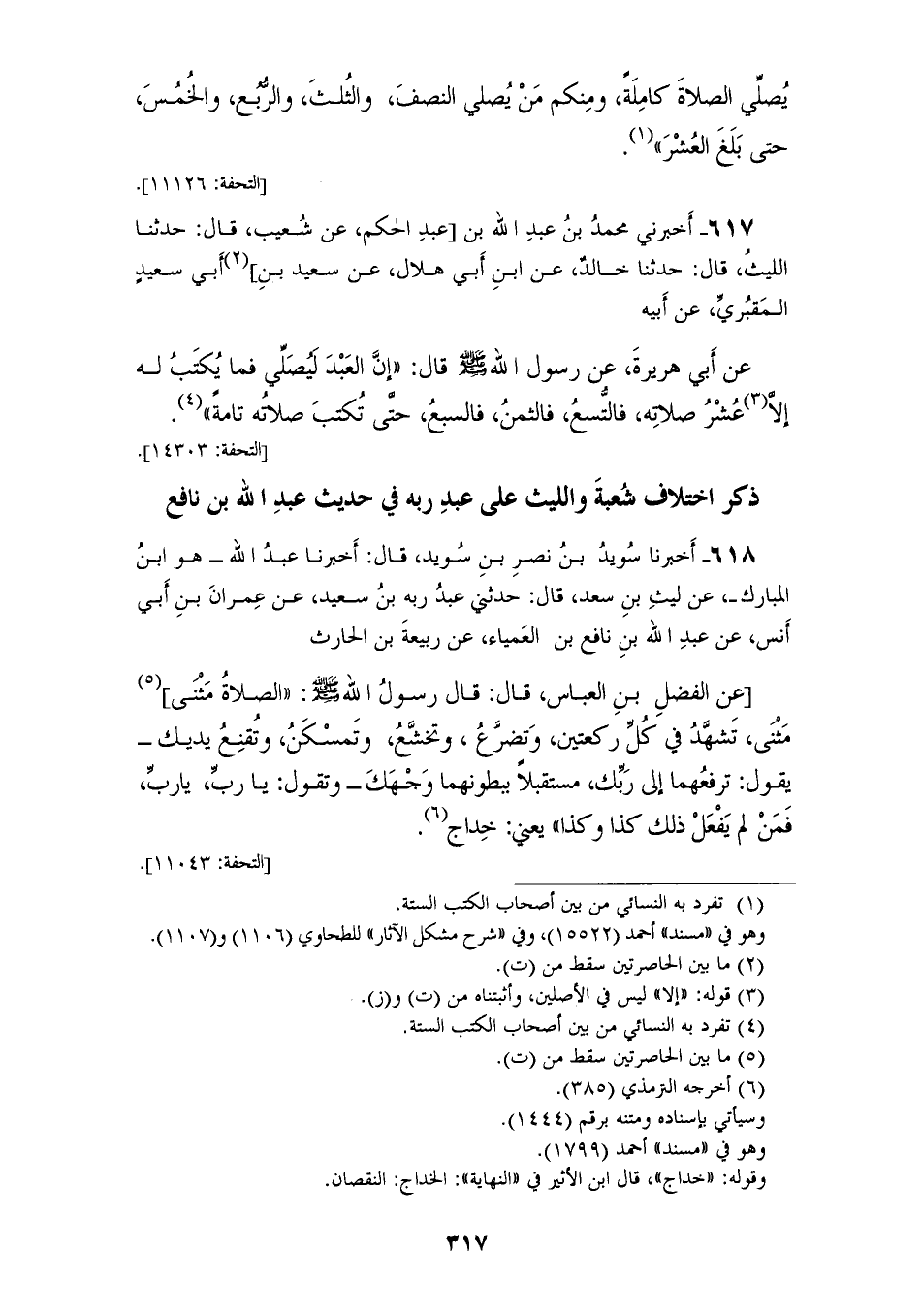 618 - أَخْبَرَنَا سُوَيْدُ بْنُ نَصْرِ بن سُوَيْدٍ قَالَ: أَخْبَرَنَا عَبْدُ اللهِ، هُوَ ابْنُ الْمُبَارَكِ، عَنْ لَيْثِ بْنِ سَعْدٍ قَالَ: حَدَّثَنِي عَبْدُ رَبِّهِ بْنُ سَعِيدٍ، عَنْ عِمْرَانَ بْنِ أَبِي أَنَسٍ، عَنْ عَبْدِ اللهِ بْنِ نَافِعِ بْنِ الْعَمْيَاءِ، عَنْ رَبِيعَةَ بْنِ الْحَارِثِ، عَنِ الْفَضْلِ بْنِ الْعَبَّاسِ قَالَ: قَالَ رَسُولُ اللهِ صَلَّى اللهُ عَلَيْهِ وَسَلَّمَ: «§الصَّلَاةُ مَثْنَى مَثْنَى تَشَهَّدُ فِي كُلِّ رَكْعَتَيْنِ، وَتَضَرَّعُ وَتَخَشَّعُ، وَتَمَسْكَنُ وَتُقْنِعُ يَدَيْكَ»، يَقُولُ: تَرْفَعُهُمَا إِلَى رَبِّكَ مُسْتَقْبِلًا بِبُطُونِهِمَا وَجْهِكَ، وَتَقُولُ: يَا رَبِّ، يَا رَبِّ فَمَنْ لَمْ يَفْعَلْ ذَلِكَ كَذَا وَكَذَا، يَعْنِي خِدَاجٌ " خَالَفَهُ شُعْبَةُ