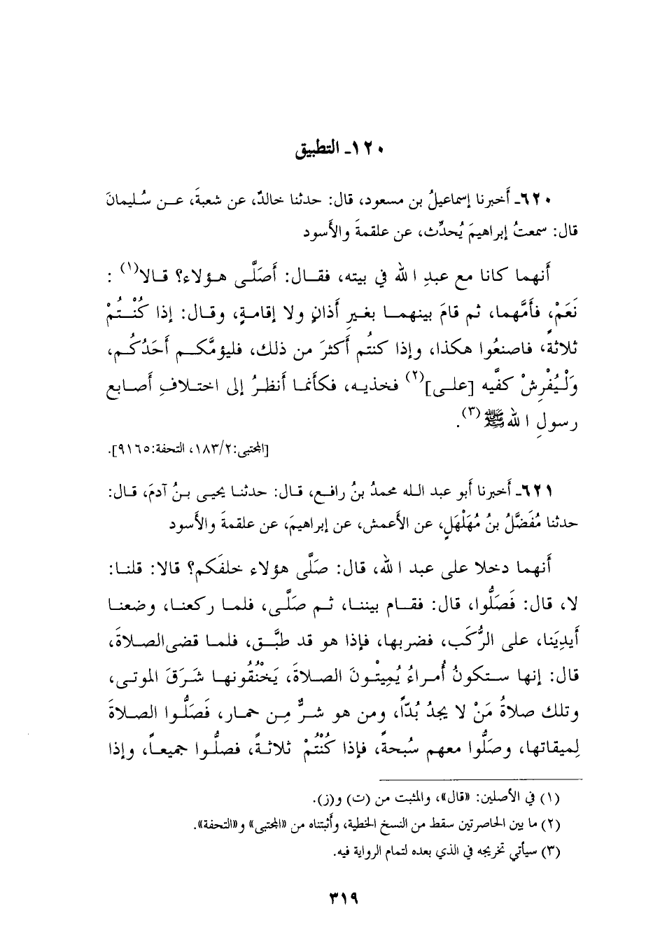 620 - أَخْبَرَنَا إِسْمَاعِيلُ بْنُ مَسْعُودٍ قَالَ: حَدَّثَنَا خَالِدٌ، عَنْ شُعْبَةَ، عَنْ سُلَيْمَانَ، قَالَ: سَمِعْتُ إِبْرَاهِيمَ، يُحَدِّثُ، عَنْ عَلْقَمَةَ، وَالْأَسْوَدِ، أَنَّهُمَا كَانَا مَعَ عَبْدِ اللهِ، فِي بَيْتِهِ، فَقَالَ: أَصَلَّى هَؤُلَاءِ؟ " قَالَا: نَعَمْ، فَأَمَّهُمَا، ثُمَّ قَامَ بَيْنَهُمَا بِغَيْرِ أَذَانٍ، وَلَا إِقَامَةٍ وَقَالَ: «§إِذَا كُنْتُمْ ثَلَاثَةً، فَاصْنَعُوا هَكَذَا، وَإِذَا كُنْتُمْ أَكْثَرَ مِنْ ذَلِكَ، فَلْيَؤُمَّكُمْ أَحَدُكُمْ، وَلْيَفْرِشْ كَفَّيْهِ عَلَى فَخِذَيْهِ فَكَأَنَّمَا أَنْظُرُ إِلَى اخْتِلَافِ أَصَابِعِ رَسُولِ اللهِ صَلَّى اللهُ عَلَيْهِ وَسَلَّمَ»