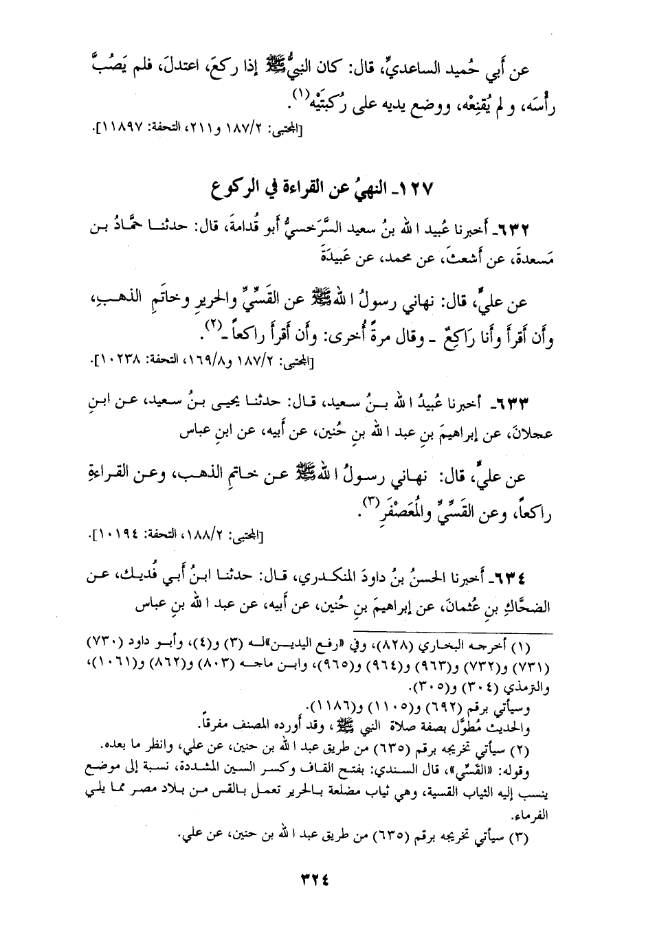 632 - أَخْبَرَنَا عُبَيْدُ اللهِ بْنُ سَعِيدٍ السَّرَخْسِيُّ أَبُو قُدَامَةَ قَالَ: حَدَّثَنَا حَمَّادُ بْنُ مَسْعَدَةَ، عَنْ أَشْعَثَ، عَنْ مُحَمَّدٍ، عَنْ عُبَيْدَةَ، عَنْ عَلِيٍّ قَالَ: «§نَهَانِي رَسُولُ اللهِ صَلَّى اللهُ عَلَيْهِ وَسَلَّمَ، عَنِ الْقَسِّيِّ، وَالْحَرِيرِ، وَخَاتَمِ الذَّهَبِ، وَأَنْ أَقْرَأَ وَأَنَا رَاكِعٌ» وَقَالَ مَرَّةً أُخْرَى «وَأَنْ أَقْرَأَ رَاكِعًا»