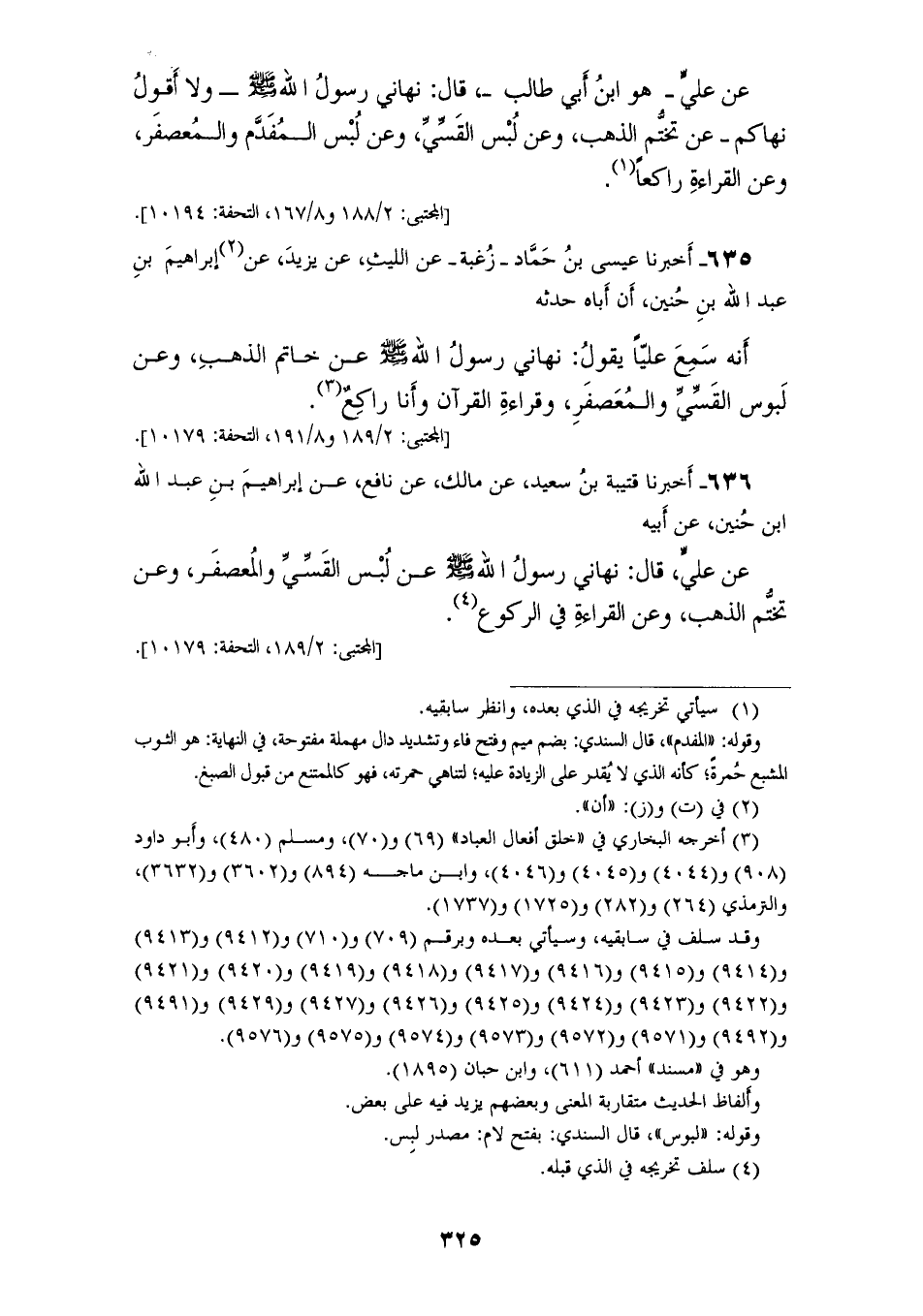636 - أَخْبَرَنَا قُتَيْبَةُ بْنُ سَعِيدٍ، عَنْ مَالِكٍ، عَنْ نَافِعٍ، عَنْ إِبْرَاهِيمَ بْنِ عَبْدِ اللهِ بْنِ حُنَيْنٍ، عَنْ أَبِيهِ، عَنْ عَلِيٍّ قَالَ: «§نَهَانِي رَسُولُ اللهِ صَلَّى اللهُ عَلَيْهِ وَسَلَّمَ، عَنْ لُبِسِ الْقَسِّيِّ وَالْمُعَصْفَرِ، وَعَنْ تَخَتُّمِ الذَّهَبِ، وَعَنِ الْقِرَاءَةِ فِي الرُّكُوعِ»