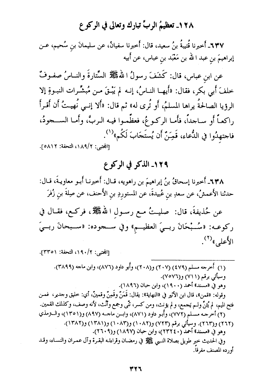637 - أَخْبَرَنَا قُتَيْبَةُ بْنُ سَعِيدٍ قَالَ: أَخْبَرَنَا سُفْيَانُ، عَنْ سُلَيْمَانَ بْنِ سُحَيْمٍ، عَنْ إِبْرَاهِيمَ بْنِ عَبْدِ اللهِ بْنِ مَعْبَدِ بْنِ عَبَّاسٍ، عَنْ أَبِيهِ، عَنِ ابْنِ عَبَّاسٍ قَالَ: كَشَفَ رَسُولُ اللهِ صَلَّى اللهُ عَلَيْهِ وَسَلَّمَ السِّتَارَةَ، وَالنَّاسُ صُفُوفٌ خَلْفَ أَبِي بَكْرٍ، فَقَالَ: «أَيُّهَا النَّاسُ إِنَّهُ لَمْ يَبْقَ مِنْ مُبَشِّرَاتِ النُّبُوَّةِ إِلَّا الرُّؤْيَا الصَّالِحَةُ، يَرَاهَا الْمُسْلِمُ أَوْ تُرَى لَهُ»، ثُمَّ قَالَ: «أَلَا إِنِّي §نُهِيتُ أَنْ أَقْرَأَ رَاكِعًا أَوْ سَاجِدًا، فَأَمَّا الرُّكُوعُ فَعَظِّمُوا فِيهِ الرَّبَّ، وَأَمَّا السُّجُودُ فَاجْتَهِدُوا فِي الدُّعَاءِ، قَمَنٌ أَنْ يُسْتَجَابَ لَكُمْ»