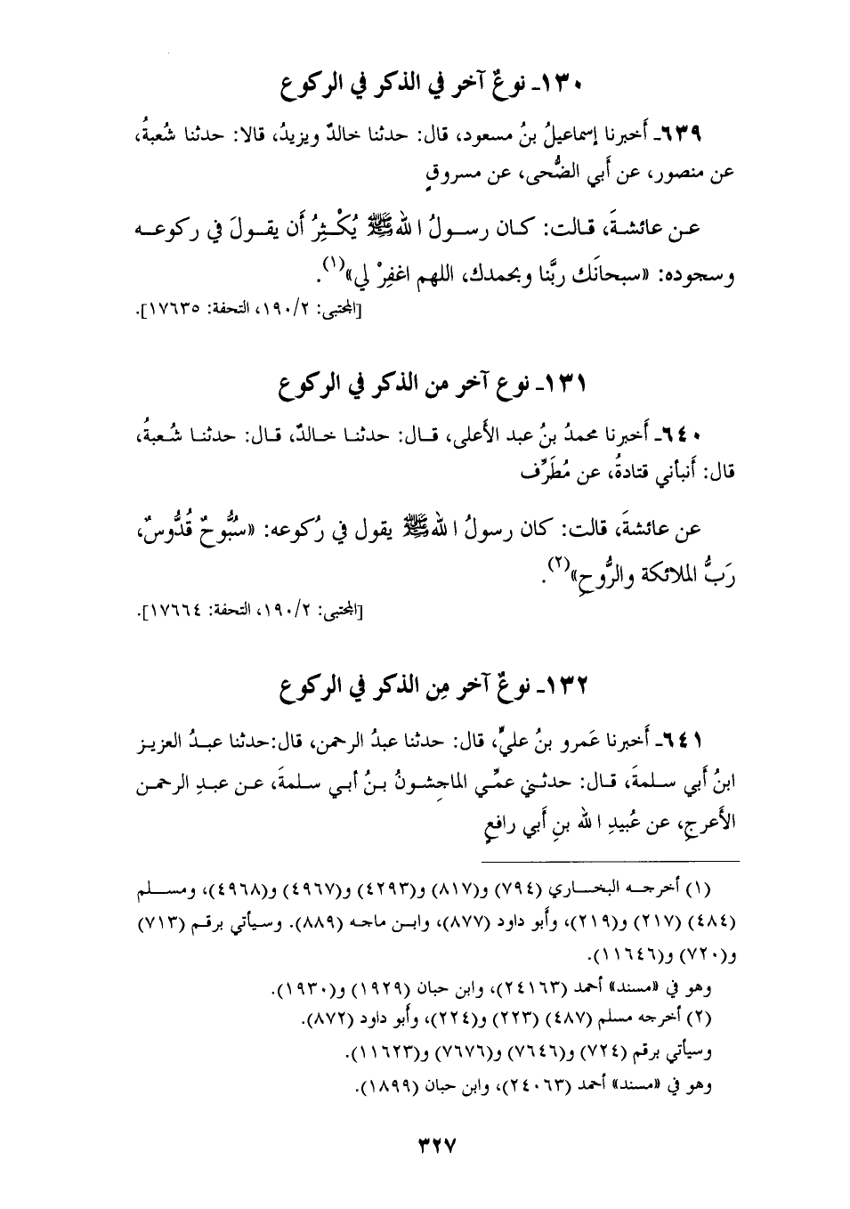 640 - أَخْبَرَنَا مُحَمَّدُ بْنُ عَبْدِ الْأَعْلَى قَالَ: حَدَّثَنَا خَالِدٌ قَالَ: حَدَّثَنَا شُعْبَةُ قَالَ: أَنْبَأَنِي قَتَادَةُ، عَنْ مُطَرِّفٍ، عَنْ عَائِشَةَ قَالَتْ: كَانَ رَسُولُ اللهِ صَلَّى اللهُ عَلَيْهِ وَسَلَّمَ، §يَقُولُ فِي رُكُوعَهُ: «سُبُّوحٌ قُدُّوسٌ رَبُّ الْمَلَائِكَةِ وَالرُّوحِ»