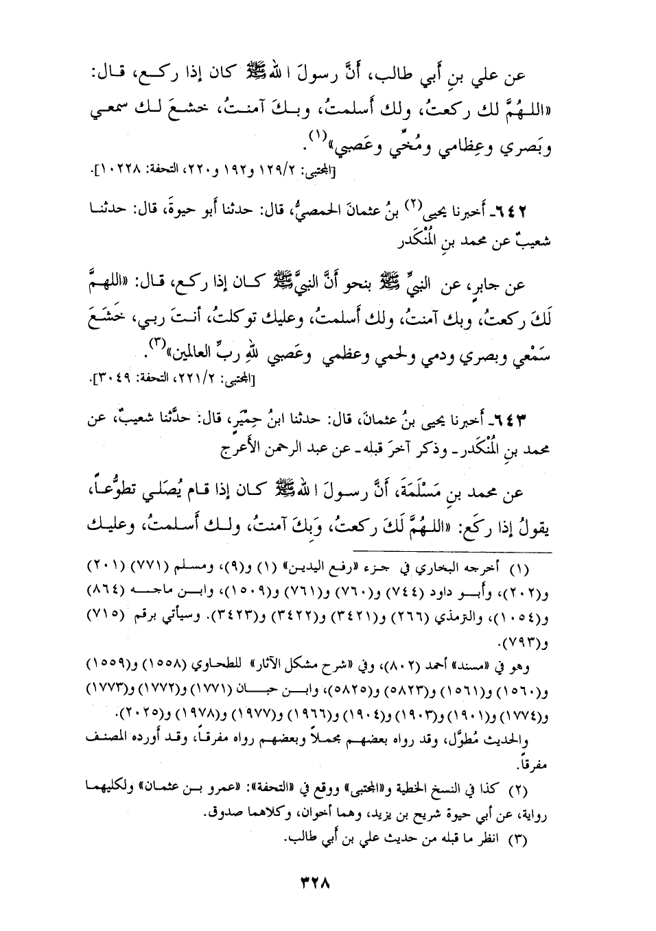 642 - أَخْبَرَنَا يَحْيَى بْنُ عُثْمَانَ الْحِمْصِيُّ قَالَ: حَدَّثَنَا أَبُو حَيْوَةَ قَالَ: حَدَّثَنَا شُعَيْبٌ، عَنْ مُحَمَّدِ بْنِ الْمُنْكَدِرِ، عَنْ جَابِرٍ، عَنِ النَّبِيِّ صَلَّى اللهُ عَلَيْهِ وَسَلَّمَ بِنَحْوٍ: أَنَّ النَّبِيَّ صَلَّى اللهُ عَلَيْهِ وَسَلَّمَ كَانَ إِذَا رَكَعَ قَالَ: «§اللهُمَّ لَكَ رَكَعْتُ، وَبِكَ آمَنْتُ، وَلَكَ أَسْلَمْتُ، وَعَلَيْكَ تَوَكَّلْتُ، أَنْتَ رَبِّي خَشَعَ سَمْعِي، وَبَصَرِي، وَدَمِي، وَلَحْمِي، وَعَظْمِي، وَعَصَبِي، لِلَّهِ رَبِّ الْعَالَمِينَ»