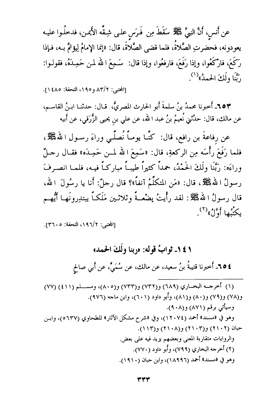 653 - أَخْبَرَنَا مُحَمَّدُ بْنُ سَلَمَةَ أَبُو الْحَارِثِ الْمِصْرِيُّ، قَالَ: حَدَّثَنَا ابْنُ الْقَاسِمِ، عَنْ مَالِكٍ، قَالَ: حَدَّثَنِي نُعَيْمُ بْنُ عَبْدِ اللهِ، عَنْ عَلِيِّ بْنِ يَحْيَى الزُّرَقِيِّ، عَنْ أَبِيهِ، عَنْ رِفَاعَةَ بْنِ رَافِعٍ قَالَ: كُنَّا يَوْمًا نُصَلِّي وَرَاءَ رَسُولِ اللهِ صَلَّى اللهُ عَلَيْهِ وَسَلَّمَ، §فَلَمَّا رَفَعَ رَأْسَهُ مِنَ الرَّكْعَةِ، قَالَ: «سَمِعَ اللهُ لِمَنْ حَمِدَهُ»، فَقَالَ رَجُلٌ وَرَاءَهُ: رَبِّنَا وَلَكَ الْحَمْدُ حَمْدًا كَثِيرًا طَيِّبًا مُبَارَكًا فِيهِ، فَلَمَّا انْصَرَفَ رَسُولُ اللهِ صَلَّى اللهُ عَلَيْهِ وَسَلَّمَ، قَالَ: «مِنَ الْمُتَكَلِّمُ آنِفًا؟» قَالَ رَجُلٌ: أَنَا يَا رَسُولَ اللهِ، قَالَ رَسُولُ اللهِ صَلَّى اللهُ عَلَيْهِ وَسَلَّمَ: «لَقَدْ رَأَيْتُ بِضْعَةً وَثَلَاثِينَ مَلِكًا يَبْتَدِرُونَهَا أَيُّهُمْ يَكْتُبُهَا أَوَّلُ؟»