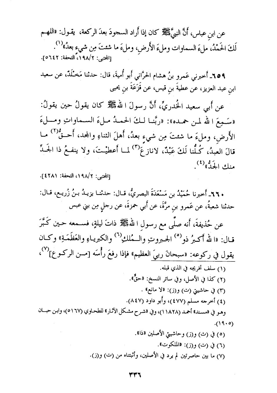 659 - أَخْبَرَنِي عَمْرُو بْنُ هِشَامٍ الْحَرَّانِيُّ أَبُو أُمَيَّةَ، قَالَ: حَدَّثَنَا مَخْلَدٌ، عَنْ سَعِيدِ بْنِ عَبْدِ الْعَزِيزِ، عَنْ عَطِيَّةَ بْنِ قَيْسٍ، عَنْ قَزْعَةَ بْنِ يَحْيَى، عَنْ أَبِي سَعِيدٍ الْخُدْرِيِّ، أَنَّ رَسُولَ اللهِ صَلَّى اللهُ عَلَيْهِ وَسَلَّمَ كَانَ يَقُولُ حِينَ يَقُولُ: «§سَمِعَ اللهُ لِمَنْ حَمِدَهُ، رَبِّنَا لَكَ الْحَمْدُ مِلْءَ السَّمَوَاتِ، وَمِلْءَ الْأَرْضِ، وَمِلْءَ مَا شِئْتَ مِنْ شَيْءٍ بَعْدُ، أَهْلَ الثَّنَاءِ وَالْمَجْدِ، أَحَقُّ مَا قَالَ الْعَبْدُ، كُلُّنَا لَكَ عَبْدٌ، لَا نَازَعَ لَمَّا أَعْطَيْتَ، وَلَا يَنْفَعُ ذَا الْجَدِّ مِنْكَ الْجَدُّ»
