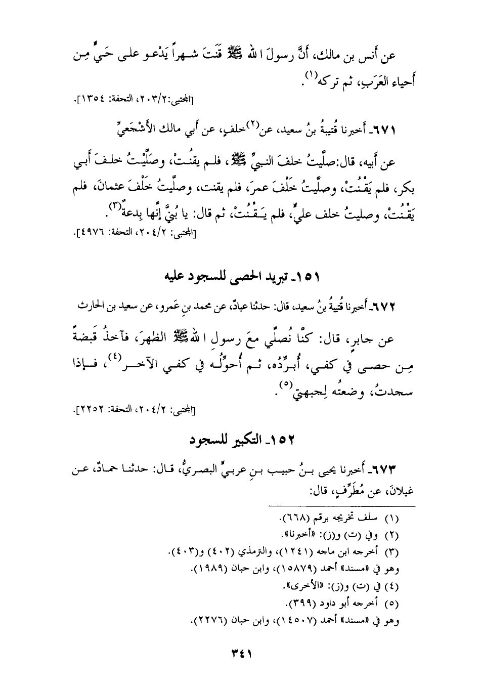 671 - أَخْبَرَنَا قُتَيْبَةُ بْنُ سَعِيدٍ، عَنْ خَلَفٍ، عَنْ أَبِي مَالِكٍ الْأَشْجَعِيِّ، عَنْ أَبِيهِ، قَالَ: §صَلَّيْتُ خَلْفَ النَّبِيِّ صَلَّى اللهُ عَلَيْهِ وَسَلَّمَ فَلَمْ يَقْنُتْ، وَصَلَّيْتُ خَلْفَ أَبِي بَكْرٍ فَلَمْ يَقْنُتْ، وَصَلَّيْتُ خَلْفَ عُمَرَ فَلَمْ يَقْنُتْ، وَصَلَّيْتُ خَلْفَ عُثْمَانَ فَلَمْ يَقْنُتْ، وَصَلَّيْتُ خَلْفَ عَلِيٍّ فَلَمْ يَقْنُتْ، ثُمَّ قَالَ: يَا بُنَيَّ إِنَّهَا بِدْعَةٌ "