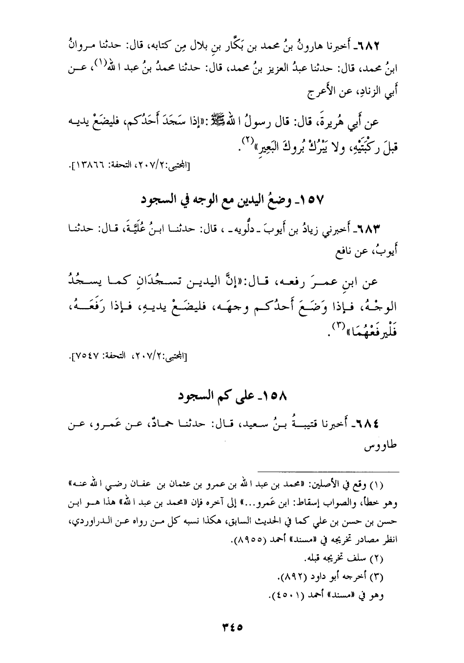 682 - أَخْبَرَنَا هَارُونُ بْنُ مُحَمَّدِ بْنِ بَكَّارِ بْنِ بِلَالٍ مِنْ كِتَابِهِ قَالَ: حَدَّثَنَا مَرْوَانُ بْنُ مُحَمَّدٍ قَالَ: حَدَّثَنَا عَبْدُ الْعَزِيزِ بْنِ مُحَمَّدٍ قَالَ: حَدَّثَنَا مُحَمَّدُ بْنُ عَبْدِ اللهِ، عَنْ أَبِي الزِّنَادِ، عَنِ الْأَعْرَجِ، عَنْ أَبِي هُرَيْرَةَ قَالَ: قَالَ رَسُولُ اللهِ صَلَّى اللهُ عَلَيْهِ وَسَلَّمَ: «§إِذَا سَجَدَ أَحَدُكُمْ فَلْيَضَعْ يَدَيْهِ قَبْلَ رُكْبَتَيْهِ، وَلَا يَبْرُكُ بُرُوكَ الْبَعِيرِ»