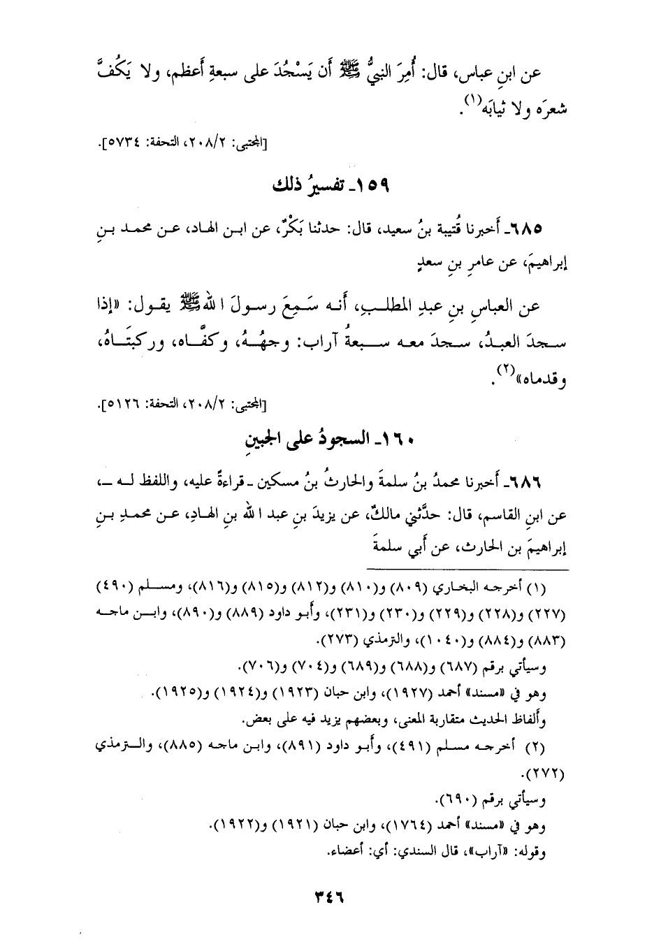 685 - أَخْبَرَنَا قُتَيْبَةُ بْنُ سَعِيدٍ قَالَ: حَدَّثَنَا بَكْرٌ، عَنِ ابْنِ الْهَادِ، عَنْ مُحَمَّدِ بْنِ إِبْرَاهِيمَ، عَنْ عَامِرِ بْنِ سَعْدٍ، عَنِ الْعَبَّاسِ بْنِ عَبْدِ الْمُطَّلِبِ أَنَّهُ سَمِعَ رَسُولَ اللهِ صَلَّى اللهُ عَلَيْهِ وَسَلَّمَ يَقُولُ: «§إِذَا سَجَدَ الْعَبْدُ سَجَدَ مَعَهُ سَبْعَةُ آرَابٍ وَجْهُهُ، وَكَفَّاهُ، وَرُكْبَتَاهُ، وَقَدَمَاهُ»