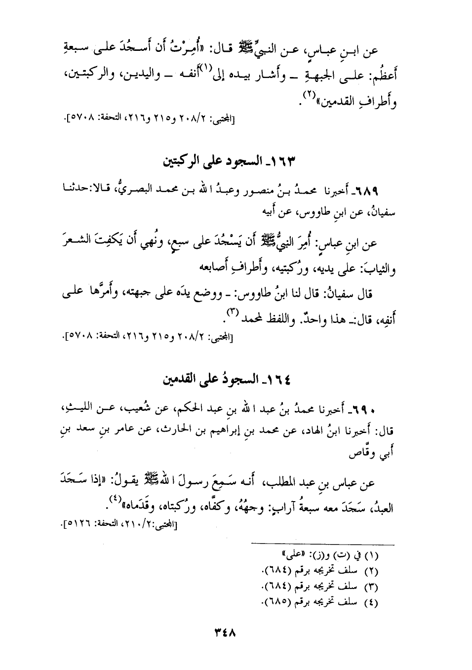 689 - أَخْبَرَنَا مُحَمَّدُ بْنُ مَنْصُورٍ، وَعَبْدُ اللهِ بْنُ مُحَمَّدٍ الْبَصْرِيُّ قَالَا: حَدَّثَنَا سُفْيَانُ، عَنِ ابْنِ طَاوُسٍ، عَنْ أَبِيهِ، عَنِ ابْنِ عَبَّاسٍ، " §أُمِرَ النَّبِيُّ صَلَّى اللهُ عَلَيْهِ وَسَلَّمَ أَنْ يَسْجُدَ عَلَى سَبْعٍ، وَنُهِيَ أَنْ يَكْفِتَ الشَّعْرَ، وَالثِّيَابَ عَلَى يَدَيْهِ، وَرُكْبَتَيْهِ وَأَطْرَافِ أَصَابِعِهِ، قَالَ سُفْيَانُ قَالَ لَنَا ابْنُ طَاوُسٍ: وَوَضَعَ يَدَهُ عَلَى جَبْهَتِهِ، وَأَمَرَّهَا عَلَى أَنْفِهِ " قَالَ: هَذَا وَاحِدٌ وَاللَّفْظُ لِمُحَمَّدٍ