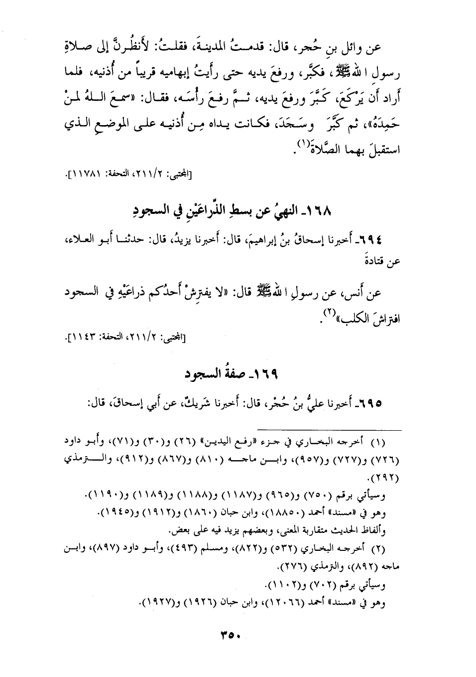 695 - أَخْبَرَنَا عَلِيُّ بْنُ حُجْرٍ قَالَ: أَخْبَرَنَا شَرِيكٌ، عَنْ أَبِي إِسْحَاقَ قَالَ: وَصَفَ لَنَا الْبَرَاءُ السُّجُودَ §فَوَضَعَ يَدَيْهِ بِالْأَرْضِ، وَرَفَعَ عَجِيزَتَهُ وَقَالَ: «هَكَذَا رَأَيْتُ النَّبِيَّ صَلَّى اللهُ عَلَيْهِ وَسَلَّمَ يَفْعَلُ»