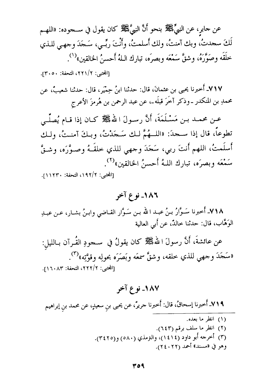 717 - أَخْبَرَنَا يَحْيَى بْنُ عُثْمَانَ قَالَ: حَدَّثَنَا ابْنُ حِمْيَرٍ قَالَ: حَدَّثَنَا شُعَيْبٌ، عَنْ مُحَمَّدِ بْنِ الْمُنْكَدِرِ، وَذَكَرَ آخَرَ قَبْلَهُ، عَنْ عَبْدِ الرَّحْمَنِ بْنِ هُرْمُزَ الْأَعْرَجِ، عَنْ مُحَمَّدِ بْنِ مَسْلَمَةَ أَنَّ رَسُولَ اللهِ صَلَّى اللهُ عَلَيْهِ وَسَلَّمَ، كَانَ إِذَا قَامَ يُصَلِّي تَطَوُّعًا قَالَ إِذَا سَجَدَ: «§اللهُمَّ لَكَ سَجَدْتُ، وَبِكَ آمَنْتُ، وَلَكَ أَسْلَمْتُ، اللهُمَّ أَنْتَ رَبِّي، سَجَدَ وَجْهِي لِلَّذِي خَلْقَهُ، وَصَوَّرَهُ، وَشَقَّ سَمْعَهُ، وَبَصَرَهُ، تَبَارَكَ اللهُ أَحْسَنُ الْخَالِقِينَ»