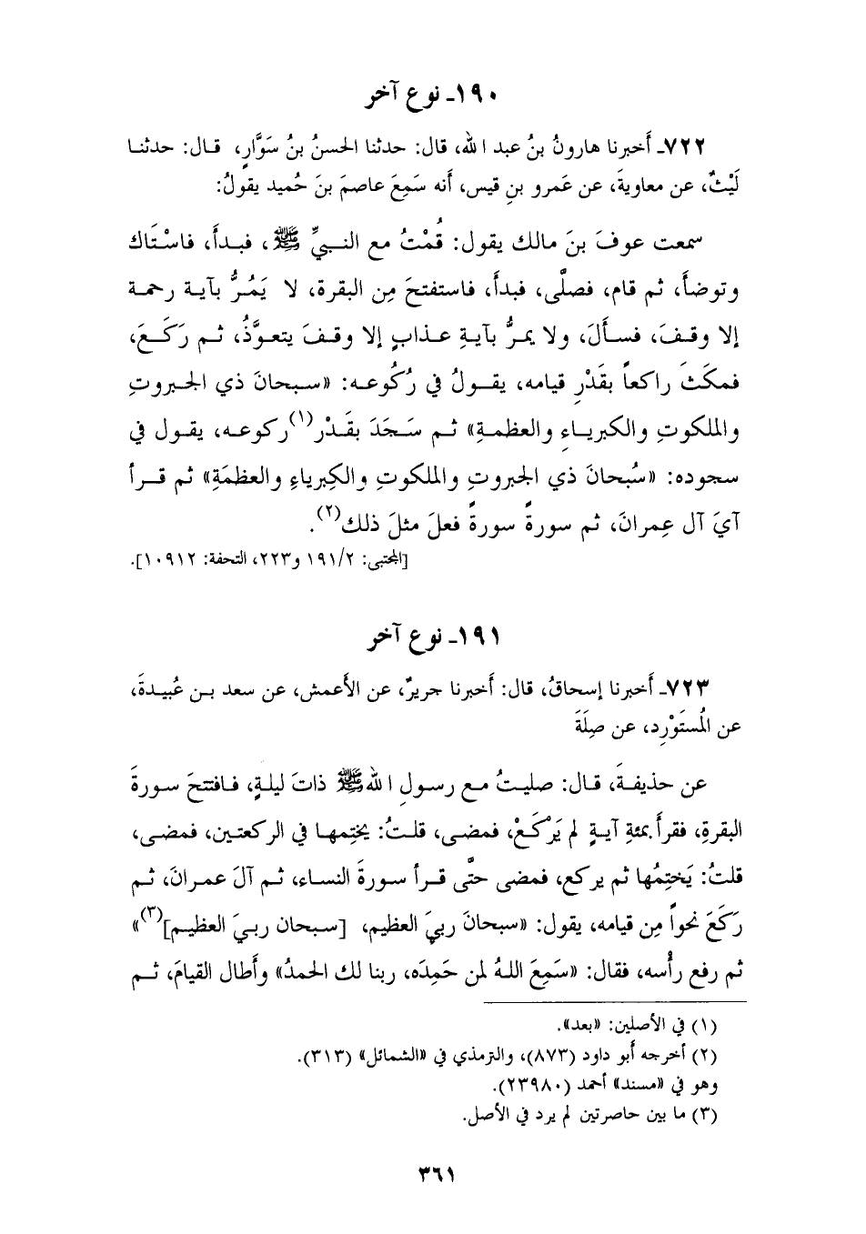 722 - أَخْبَرَنَا هَارُونُ بْنُ عَبْدِ اللهِ قَالَ: حَدَّثَنَا الْحَسَنُ بْنُ سَوَّارٍ قَالَ: حَدَّثَنَا لَيْثٌ، عَنْ مُعَاوِيَةَ، عَنْ عَمْرِو بْنِ قَيْسٍ، أَنَّهُ سَمِعَ عَاصِمَ بْنَ حُمَيْدٍ يَقُولُ: سَمِعْتُ عَوْفَ بْنَ مَالِكٍ يَقُولُ: قُمْتُ مَعَ النَّبِيِّ صَلَّى اللهُ عَلَيْهِ وَسَلَّمَ، فَبَدَأَ فَاسْتَاكَ وَتَوَضَّأَ، ثُمَّ §قَامَ فَصَلَّى فَبَدَأَ فَاسْتَفْتَحَ مِنَ الْبَقَرَةِ لَا يَمُرُّ بِآيَةِ رَحْمَةٍ إِلَّا وَقَفَ فَسَأَلَ، وَلَا يَمُرُّ بِآيَةِ عَذَابٍ إِلَّا وَقَفَ يَتَعَوَّذُ، ثُمَّ رَكَعَ فَمَكَثَ رَاكِعًا بِقَدْرِ قِيَامِهِ، يَقُولُ فِي رُكُوعِهِ: «سُبْحَانَ ذِي الْجَبَرُوتِ، وَالْمَلَكُوتِ، وَالْكِبْرِيَاءِ، وَالْعَظَمَةِ»، ثُمَّ سَجَدَ بِقَدْرِ رُكُوعِهِ يَقُولُ فِي سُجُودِهِ " سُبْحَانَ ذِي الْجَبَرُوتِ، وَالْمَلَكُوتِ، وَالْكِبْرِيَاءِ، وَالْعَظَمَةِ ثُمَّ قَرَأَ آي آلَ عِمْرَانَ، ثُمَّ سُورَةً سُورَةً فَعَلَ مِثْلَ ذَلِكَ