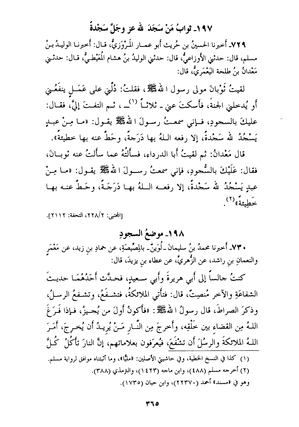 729 - أَخْبَرَنَا الْحُسَيْنُ بْنُ حُرَيْثٍ أَبُو عَمَّارٍ الْمَرْوَزِيُّ قَالَ: أَخْبَرَنَا الْوَلِيدُ بْنُ مُسْلِمٍ قَالَ: حَدَّثَنِي الْأَوْزَاعِيُّ قَالَ: حَدَّثَنِي الْوَلِيدُ بْنُ هِشَامٍ الْمُعَيْطِيُّ قَالَ: حَدَّثَنِي مَعْدَانُ بْنُ طَلْحَةَ الْيَعْمَرِيُّ قَالَ: لَقِيتُ ثَوْبَانَ مَوْلَى رَسُولِ اللهِ صَلَّى اللهُ عَلَيْهِ وَسَلَّمَ، فَقُلْتُ: دُلَّنِي عَلَى عَمَلٍ يَنْفَعُنِي، أَوْ يُدْخِلُنِي الْجَنَّةَ، فَأُسْكِتَ عَنِّي ثَلَاثًا، ثُمَّ الْتَفَتَ إِلَيَّ، فَقَالَ: عَلَيْكَ بِالسُّجُودِ، فَإِنِّي سَمِعْتُ رَسُولَ اللهِ صَلَّى اللهُ عَلَيْهِ وَسَلَّمَ، يَقُولُ: «§مَا مِنْ عَبْدٍ يَسْجُدُ لِلَّهِ سَجْدَةً إِلَّا رَفَعَهُ اللهُ بِهَا دَرَجَةً، وَحَطَّ عَنْهُ بِهَا خَطِيئَةً»، قَالَ مَعْدَانُ: ثُمَّ لَقِيتُ أَبَا الدَّرْدَاءِ، فَسَأَلْتُهُ عَمَّا سَأَلْتُ عَنْهُ ثَوْبَانَ، فَقَالَ: عَلَيْكَ بِالسُّجُودِ فَإِنِّي سَمِعْتُ رَسُولَ اللهِ صَلَّى اللهُ عَلَيْهِ وَسَلَّمَ، يَقُولُ: «مَا مِنْ عَبْدٍ يَسْجُدُ لِلَّهِ سَجْدَةً، إِلَّا رَفَعَهُ اللهُ بِهَا دَرَجَةً وَحَطَّ عَنْهُ بِهَا خَطِيئَةً»