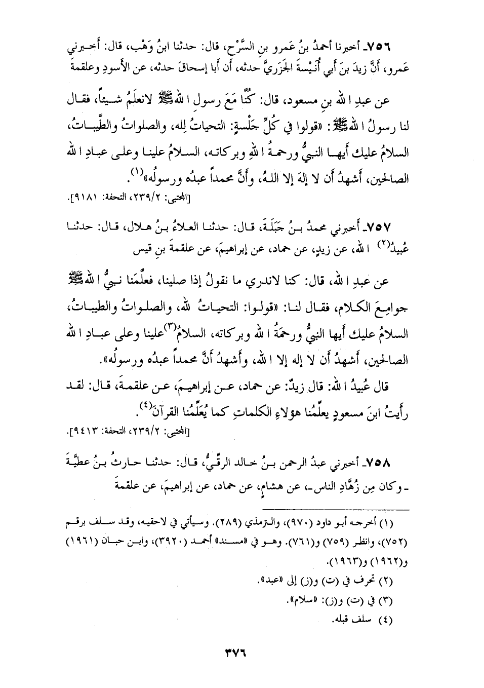 756 - أَخْبَرَنَا أَحْمَدُ بْنُ عَمْرِو بْنِ السَّرْحِ قَالَ: حَدَّثَنَا ابْنُ وَهْبٍ قَالَ: أَخْبَرَنِي عَمْرٌو، أَنَّ زَيْدَ بْنَ أَبِي أُنَيْسَةَ الْجَزَرِيِّ، حَدَّثَهُ أَنَّ أَبَا إِسْحَاقَ، حَدَّثَهُ، عَنِ الْأَسْوَدِ، وَعَلْقَمَةَ، عَنْ عَبْدِ اللهِ بْنِ مَسْعُودٍ قَالَ: §كُنَّا مَعَ رَسُولِ اللهِ صَلَّى اللهُ عَلَيْهِ وَسَلَّمَ، لَا نَعْلَمُ شَيْئًا فَقَالَ لَنَا رَسُولُ اللهِ صَلَّى اللهُ عَلَيْهِ وَسَلَّمَ: قُولُوا فِي كُلِّ جِلْسَةٍ: «التَّحِيَّاتُ لِلَّهِ، وَالصَّلَوَاتُ وَالطَّيِّبَاتُ، السَّلَامُ عَلَيْكَ أَيُّهَا النَّبِيُّ وَرَحْمَةُ اللهِ وَبَرَكَاتُهُ، السَّلَامُ عَلَيْنَا وَعَلَى عَبَّادِ اللهِ الصَّالِحِينَ، أَشْهَدُ أَنْ لَا إِلَهَ إِلَّا اللهُ، وَأَنَّ مُحَمَّدًا عَبْدُهُ وَرَسُولُهُ»