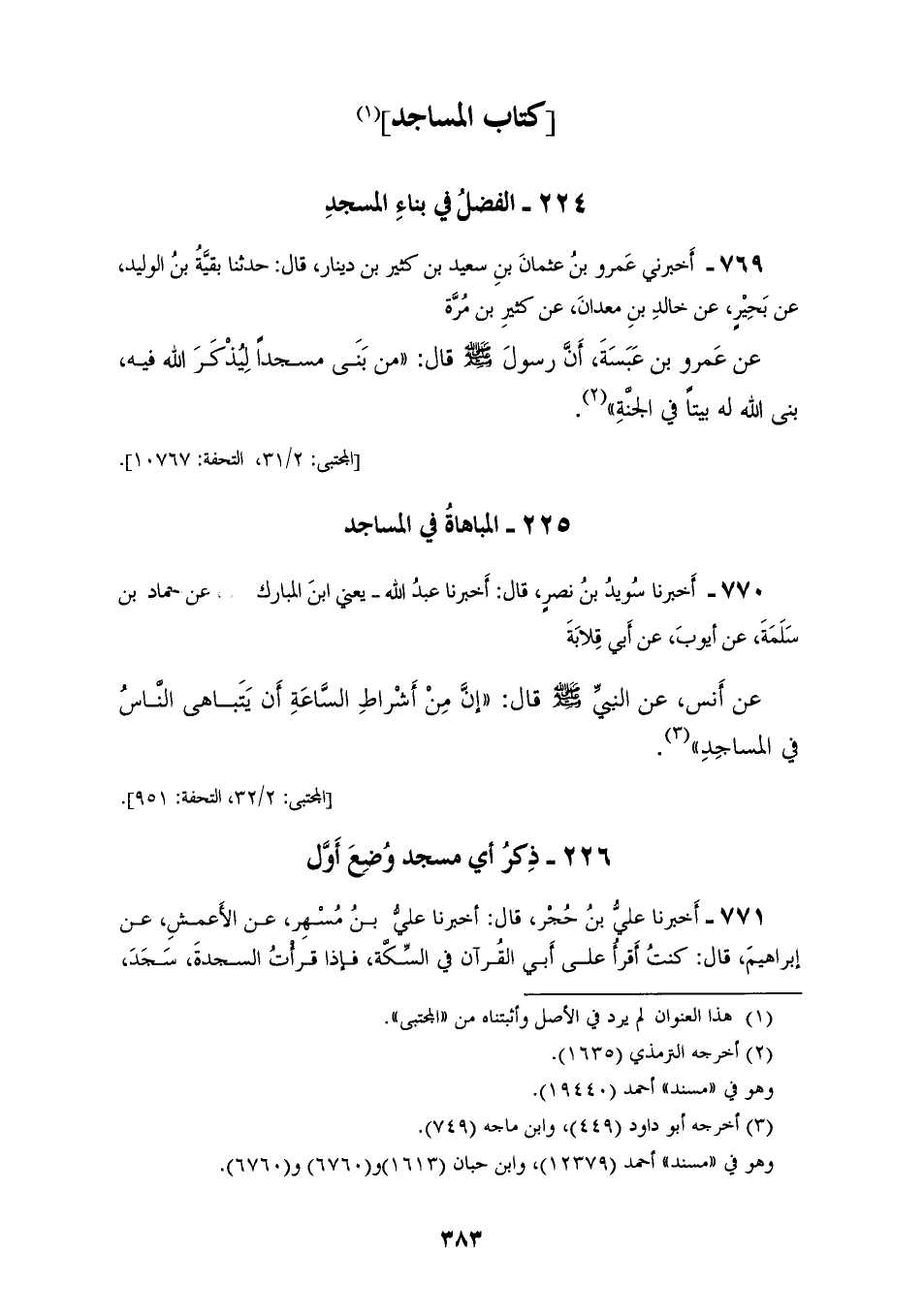 770 - أَخْبَرَنَا سُوَيْدُ بْنُ نَصْرٍ قَالَ: أَخْبَرَنَا عَبْدُ اللهِ يَعْنِي ابْنَ الْمُبَارَكِ، عَنْ حَمَّادِ بْنِ سَلَمَةَ، عَنْ أَيُّوبَ، عَنْ أَبِي قِلَابَةَ، عَنْ أَنَسٍ، عَنِ النَّبِيِّ صَلَّى اللهُ عَلَيْهِ وَسَلَّمَ، قَالَ: «إِنَّ §مِنْ أَشْرَاطِ السَّاعَةِ أَنْ يَتَبَاهَى النَّاسُ فِي الْمَسَاجِدِ»