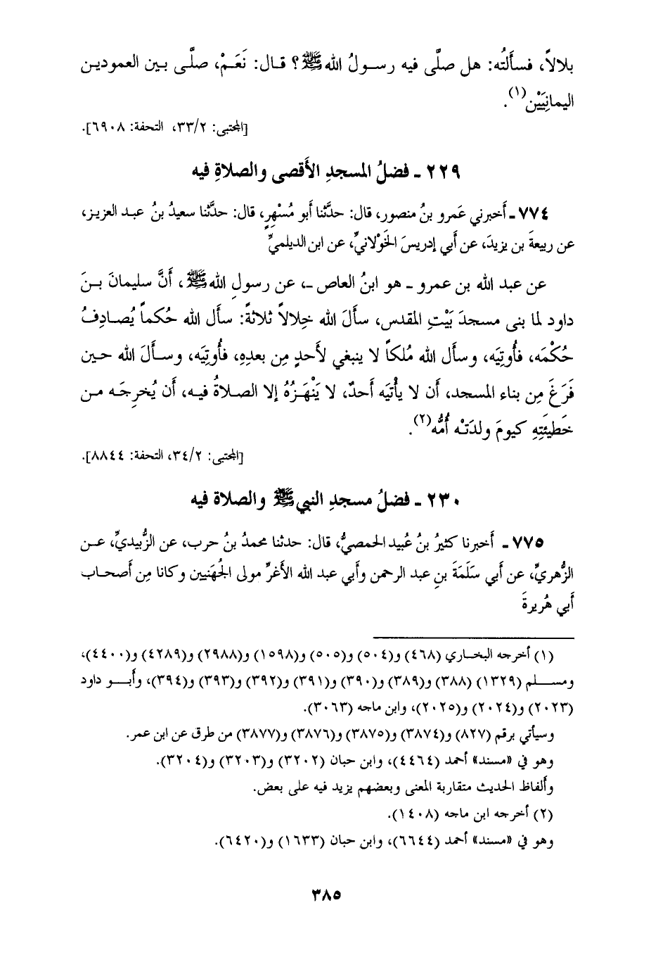 774 - أَخْبَرَنِي عَمْرُو بْنُ مَنْصُورٍ قَالَ: حَدَّثَنَا أَبُو مُسْهِرٍ قَالَ: حَدَّثَنَا سَعِيدُ بْنُ عَبْدِ الْعَزِيزِ، عَنْ رَبِيعَةَ بْنِ يَزِيدَ، عَنْ أَبِي إِدْرِيسَ الْخَوْلَانِيِّ، عَنِ ابْنِ الدَّيْلَمِيِّ، عَنْ عَبْدِ اللهِ بْنِ عَمْرٍو، هُوَ ابْنُ الْعَاصِ، عَنْ رَسُولِ اللهِ صَلَّى اللهُ عَلَيْهِ وَسَلَّمَ أَنَّ " §سُلَيْمَانَ بْنَ دَاوُدَ، لَمَّا بَنَى مَسْجِدَ بَيْتِ الْمَقْدِسِ، سَأَلَ اللهَ خِلِالًا ثَلَاثَةً: سَأَلَ اللهَ حُكْمًا يُصَادِفُ حُكْمَهُ فَأُوتِيَهُ، وَسَأَلَ اللهَ مُلْكًا لَا يَنْبَغِي لِأَحَدٍ مِنْ بَعْدِهِ فَأُوتِيَهُ، وَسَأَلَ اللهَ حِينَ فَرَغَ، مِنْ بِنَاءِ الْمَسْجِدِ أَنْ لَا يَأْتِيَهُ أَحَدٌ لَا يَنْهَزُهُ إِلَّا الصَّلَاةُ فِيهِ، أَنْ يُخْرِجَهُ مِنْ خَطِيئَتِهِ كَيَوْمِ وَلَدَتْهُ أُمُّهُ "