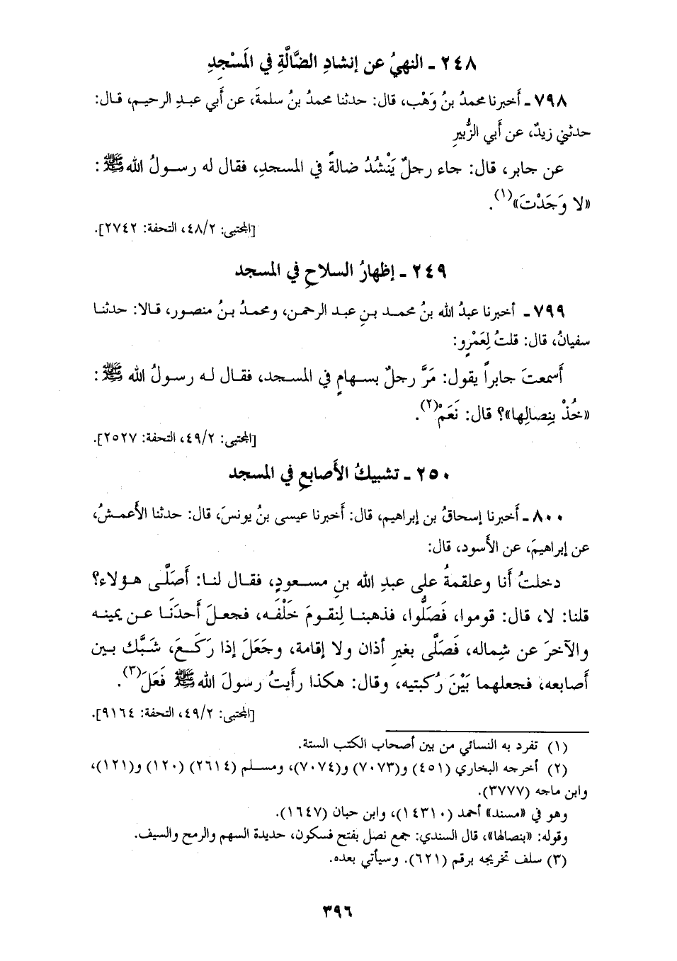 799 - أَخْبَرَنَا عَبْدُ اللهِ بْنُ مُحَمَّدِ بْنِ عَبْدِ الرَّحْمَنِ وَمُحَمَّدُ بْنُ مَنْصُورٍ قَالَا: حَدَّثَنَا سُفْيَانُ قَالَ: قُلْتُ لِعَمْرٍو، أَسَمِعْتَ جَابِرًا يَقُولُ: " §مَرَّ رَجُلٌ بِسِهَامٍ فِي الْمَسْجِدِ، فَقَالَ لَهُ رَسُولُ اللهِ صَلَّى اللهُ عَلَيْهِ وَسَلَّمَ: «خُذْ بِنِصَالِهَا»، قَالَ: نَعَمْ