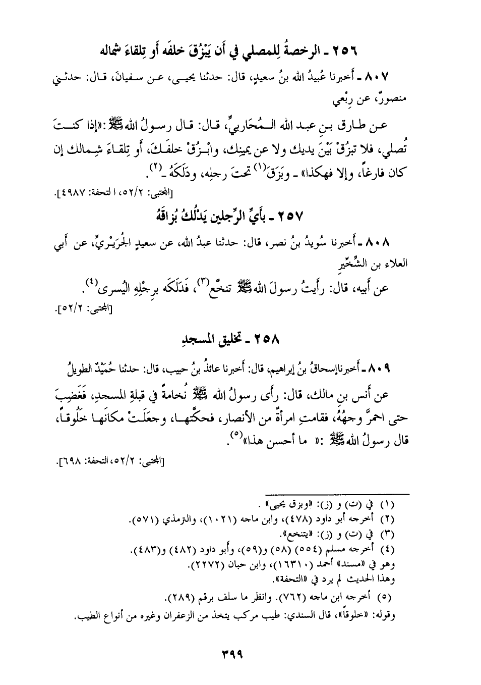 808 - أَخْبَرَنَا سُوَيْدُ بْنُ نَصْرٍ قَالَ: حَدَّثَنَا عَبْدُ اللهِ، عَنْ سَعِيدٍ الْجُرَيْرِيِّ، عَنْ أَبِي الْعَلَاءِ بْنِ الشِّخِّيرِ، عَنْ أَبِيهِ قَالَ: «§رَأَيْتُ رَسُولَ اللهِ صَلَّى اللهُ عَلَيْهِ وَسَلَّمَ، تَنَخَّعَ فَدَلَكَهُ بِرِجْلِهِ الْيُسْرَى»