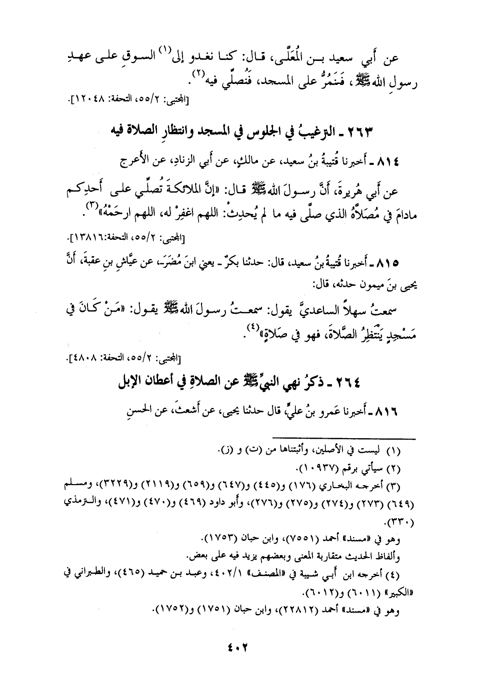813 - أَخْبَرَنَا مُحَمَّدُ بْنُ عَبْدِ اللهِ بْنِ عَبْدِ الْحَكَمِ بْنِ أَعْيَنَ، عَنْ شُعَيْبٍ، قَالَ: حَدَّثَنَا اللَّيْثُ، قَالَ: حَدَّثَنَا خَالِدٌ، عَنِ ابْنِ أَبِي هِلَالٍ، قَالَ: أَخْبَرَنِي مَرْوَانُ بْنُ عُثْمَانَ، أَنَّ عُبَيْدَ بْنِ حُنَيْنٍ، أَخْبَرَهُ عَنْ أَبِي سَعِيدٍ الْمُعَلَّى قَالَ: «§كُنَّا نَغْدُو إِلَى السُّوقِ عَلَى عَهْدِ رَسُولِ اللهِ صَلَّى اللهُ عَلَيْهِ وَسَلَّمَ، فَنَمُرُّ عَلَى الْمَسْجِدِ فَنُصَلِّي فِيهِ»