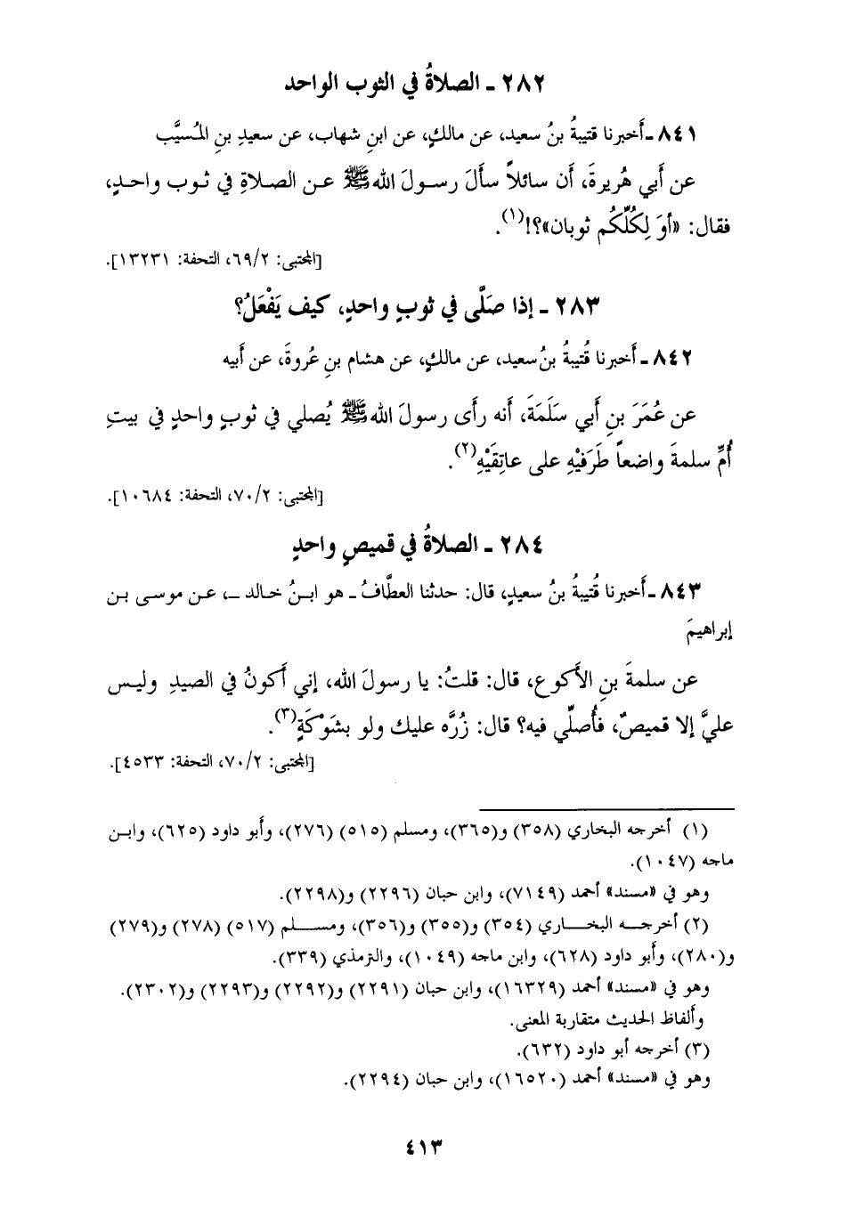 841 - أَخْبَرَنَا قُتَيْبَةُ بْنُ سَعِيدٍ، عَنْ مَالِكٍ، عَنِ ابْنِ شِهَابٍ، عَنْ سَعِيدِ بْنِ الْمُسَيِّبِ، عَنْ أَبِي هُرَيْرَةَ أَنَّ سَائِلًا سَأَلَ رَسُولَ اللهِ صَلَّى اللهُ عَلَيْهِ وَسَلَّمَ، عَنِ §الصَّلَاةِ فِي ثَوْبٍ وَاحِدٍ قَالَ: «أَوَلِكُلِّكُمْ ثَوْبَانِ؟»