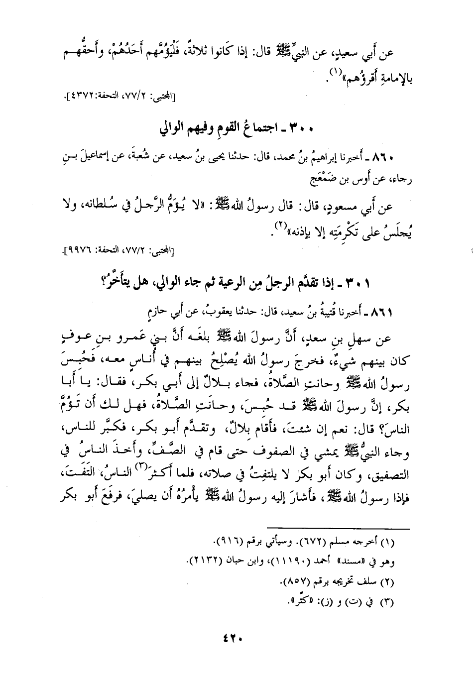 860 - أَخْبَرَنَا إِبْرَاهِيمُ بْنُ مُحَمَّدٍ قَالَ: حَدَّثَنَا يَحْيَى بْنُ سَعِيدٍ، عَنْ شُعْبَةَ عَنْ إِسْمَاعِيلَ بْنِ رَجَاءٍ، عَنْ أَوْسِ بْنِ ضَمْعَجٍ، عَنْ أَبِي مَسْعُودٍ قَالَ: قَالَ رَسُولُ اللهِ صَلَّى اللهُ عَلَيْهِ وَسَلَّمَ: «§لَا يَؤُمُّ الرَّجُلُ فِي سُلْطَانِهِ، وَلَا يُجْلَسُ عَلَى تَكْرِمَتِهِ إِلَّا بِإِذْنِهِ»
