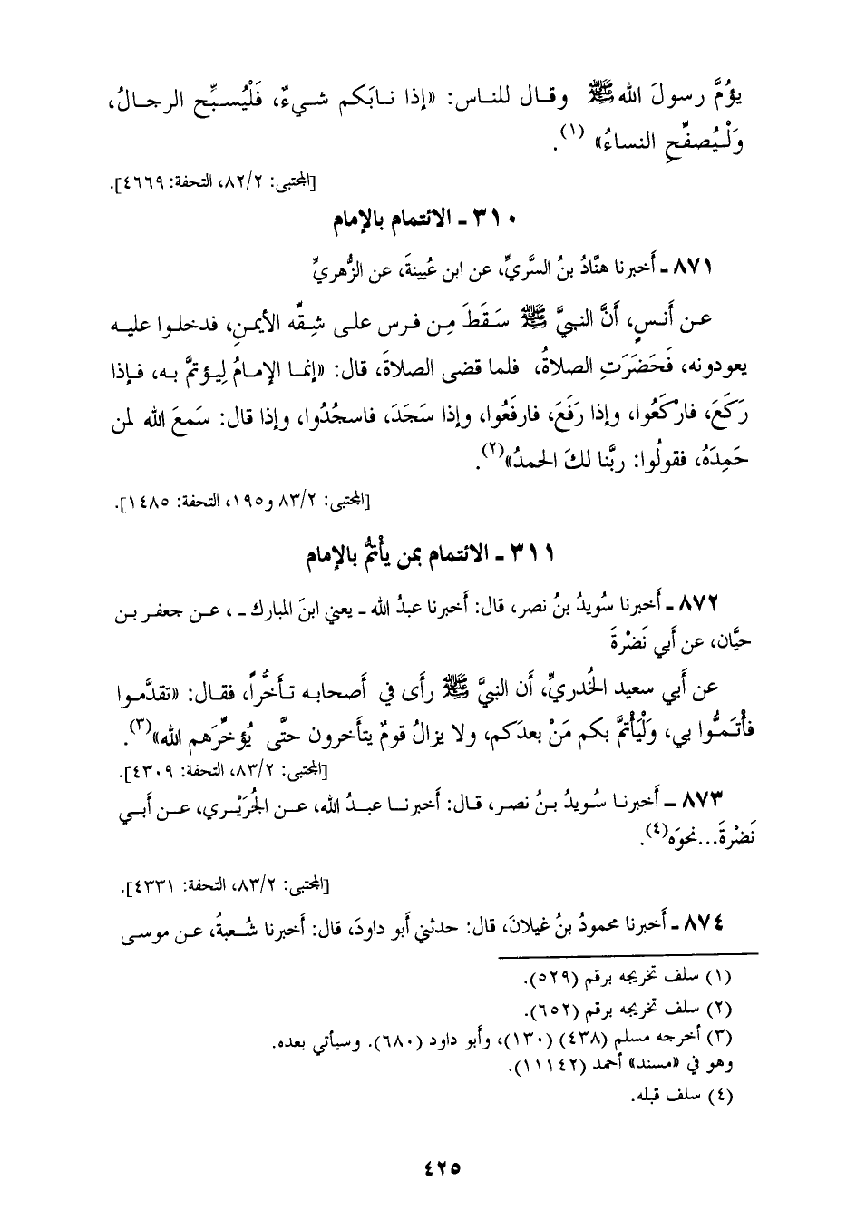871 - أَخْبَرَنَا هَنَّادُ بْنُ السَّرِيِّ، عَنِ ابْنِ عُيَيْنَةَ، عَنِ الزُّهْرِيِّ، عَنْ أَنَسٍ أَنَّ النَّبِيَّ صَلَّى اللهُ عَلَيْهِ وَسَلَّمَ سَقَطَ مِنْ فَرَسٍ عَلَى شِقِّهِ الْأَيْمَنِ، فَدَخَلُوا عَلَيْهِ يَعُودُونَهُ، فَحَضَرَتِ الصَّلَاةُ، فَلَمَّا قَضَى الصَّلَاةَ، قَالَ: " إِنَّمَا §الْإِمَامُ لِيُؤْتَمَّ بِهِ، فَإِذَا رَكَعَ فَارْكَعُوا، وَإِذَا رَفَعَ فَارْفَعُوا، وَإِذَا سَجَدَ فَاسْجُدُوا، وَإِذَا قَالَ: سَمِعَ اللهُ لِمَنْ حَمِدَهُ فَقُولُوا: رَبَّنَا لَكَ الْحَمْدُ "