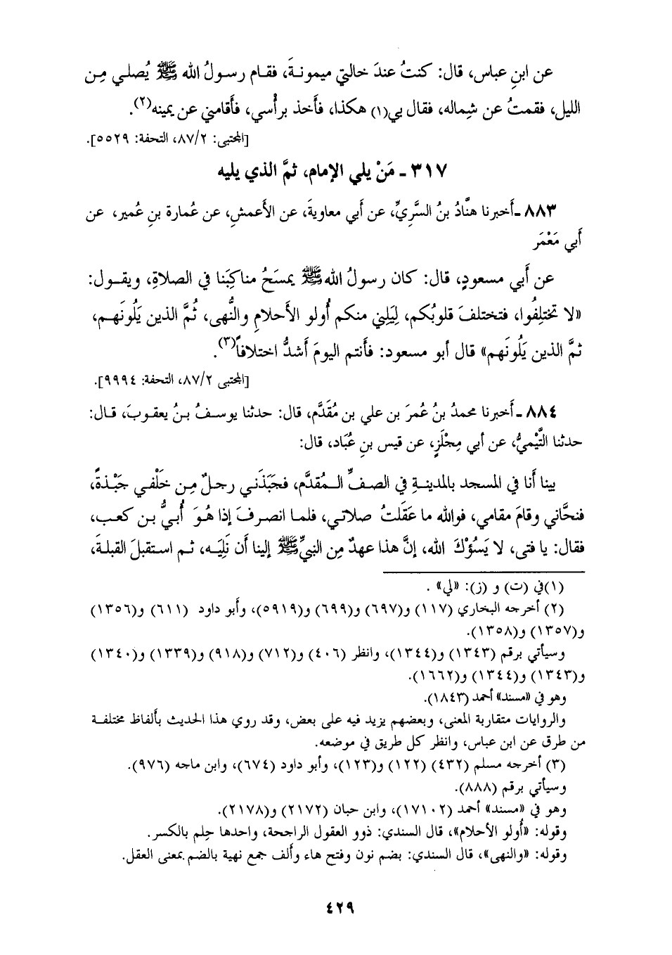 883 - أَخْبَرَنَا هَنَّادُ بْنُ السَّرِيِّ، عَنْ أَبِي مُعَاوِيَةَ، عَنِ الْأَعْمَشِ، عَنْ عُمَارَةَ بْنِ عُمَيْرٍ، عَنْ أَبِي مَعْمَرٍ، عَنْ أَبِي مَسْعُودٍ قَالَ: كَانَ رَسُولُ اللهِ صَلَّى اللهُ عَلَيْهِ وَسَلَّمَ، يَمْسَحُ مَنَاكِبَنَا فِي الصَّلَاةِ وَيَقُولُ: «§لَا تَخْتَلِفُوا فَتَخْتَلِفَ قُلُوبُكُمْ، لِيَلِنِي مِنْكُمْ أُولُو الْأَحْلَامِ وَالنُّهَى، ثُمَّ الَّذِينَ يَلُونَهُمْ ثُمَّ الَّذِينَ يَلُونَهُمْ»، قَالَ أَبُو مَسْعُودٍ: فَأَنْتُمُ الْيَوْمَ أَشَدُّ اخْتِلَافًا
