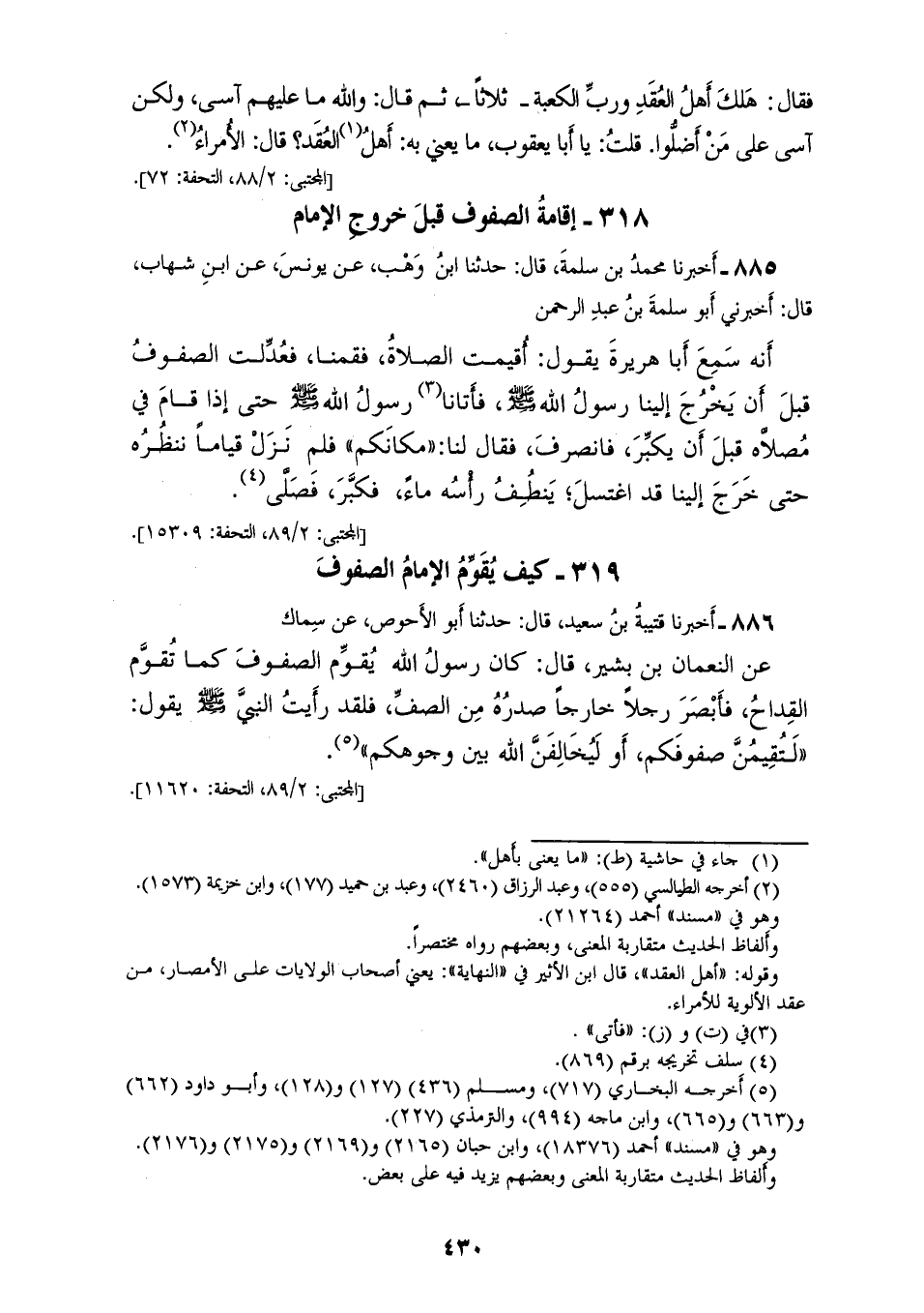 886 - أَخْبَرَنَا قُتَيْبَةُ بْنُ سَعِيدٍ قَالَ: حَدَّثَنَا أَبُو الْأَحْوَصِ، عَنْ سِمَاكٍ، عَنِ النُّعْمَانِ بْنِ بَشِيرٍ قَالَ: كَانَ رَسُولُ اللهِ صَلَّى اللهُ عَلَيْهِ وَسَلَّمَ يُقَوِّمُ الصُّفُوفَ كَمَا تُقَوَّمُ الْقِدَاحُ فَأَبْصَرَ رَجُلًا خَارِجًا صَدْرُهُ مِنَ الصَّفِّ، فَلَقَدْ رَأَيْتُ النَّبِيَّ صَلَّى اللهُ عَلَيْهِ وَسَلَّمَ يَقُولُ: «§لَتُقِيمُنَّ صُفُوفَكُمْ، أَوْ لَيُخَالِفَنَّ اللهُ بَيْنَ وُجُوهَكُمْ»
