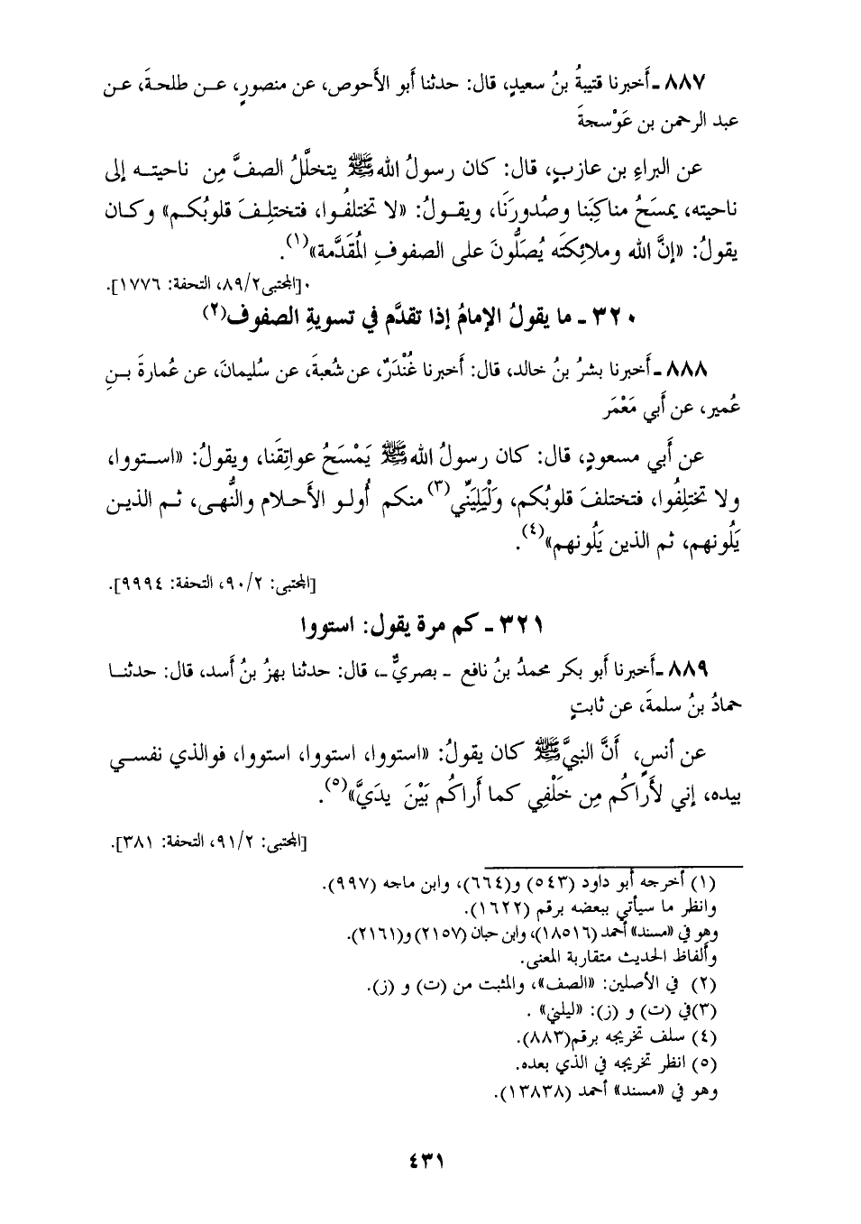 887 - أَخْبَرَنَا قُتَيْبَةُ بْنُ سَعِيدٍ قَالَ: حَدَّثَنَا أَبُو الْأَحْوَصِ، عَنْ مَنْصُورٍ، عَنْ طَلْحَةَ، عَنْ عَبْدِ الرَّحْمَنِ بْنِ عَوْسَجَةَ، عَنِ الْبَرَاءِ بْنِ عَازِبٍ قَالَ: كَانَ رَسُولُ اللهِ صَلَّى اللهُ عَلَيْهِ وَسَلَّمَ، يَتَخَلَّلُ الصَّفَّ مِنْ نَاحِيَتِهِ إِلَى نَاحِيَتِهِ يَمْسَحُ مَنَاكِبَنَا، وَصُدُورَنَا وَيَقُولُ: «§لَا تَخْتَلِفُوا فَتَخْتَلِفَ قُلُوبُكُمْ»، وَكَانَ يَقُولُ: «إِنَّ اللهَ وَمَلَائِكَتَهُ يُصَلُّونَ عَلَى الصُّفُوفِ الْمُقَدَّمَةِ»