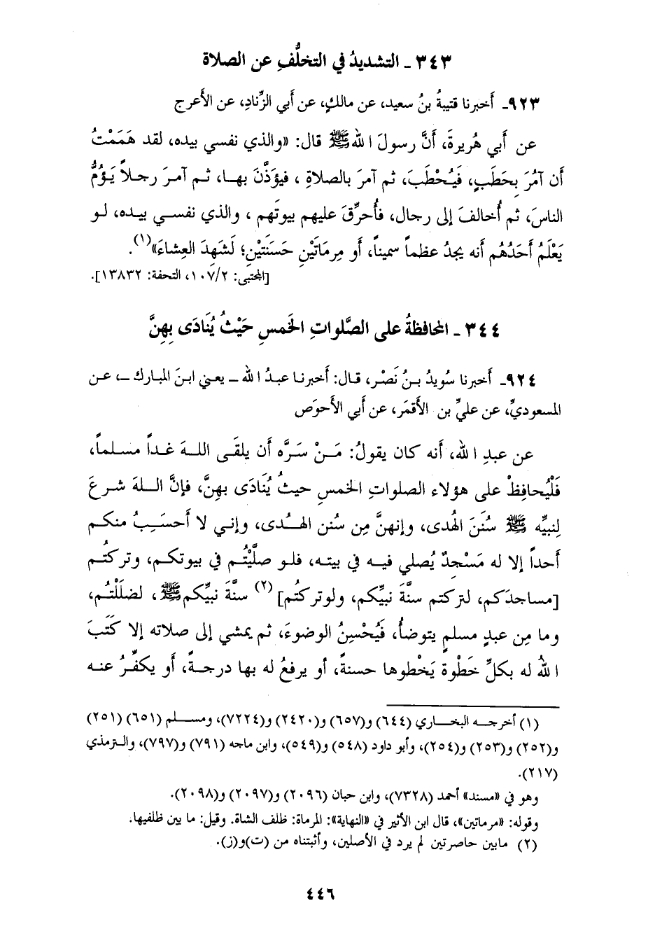 924 - أَخْبَرَنَا سُوَيْدُ بْنُ نَصْرٍ قَالَ: أَخْبَرَنَا عَبْدُ اللهِ يَعْنِي ابْنَ الْمُبَارَكِ، عَنِ الْمَسْعُودِيِّ، عَنْ عَلِيِّ بْنِ الْأَقْمَرِ، عَنْ أَبِي الْأَحْوَصِ، عَنْ عَبْدِ اللهِ أَنَّهُ كَانَ يَقُولُ: «مَنْ سَرَّهُ أَنْ يَلْقَى اللهَ غَدًا مُسْلِمًا، فَلْيُحَافِظْ عَلَى هَؤُلَاءِ §الصَّلَوَاتِ الْخَمْسِ حَيْثُ يُنَادَى بِهِنَّ، فَإِنَّ اللهَ شَرَعَ لِنَبِيِّهِ صَلَّى اللهُ عَلَيْهِ وَسَلَّمَ سُنَنَ الْهُدَى، وَإِنَّهُنَّ مِنْ سُنَنِ الْهُدَى، وَإِنِّي لَا أَحْسِبُ مِنْكُمْ أَحَدًا إِلَّا لَهُ مَسْجِدٌ يُصَلِّي فِيهِ فِي بَيْتِهِ، فَلَوْ صَلَّيْتُمْ فِي بُيُوتِكُمْ، وَتَرَكْتُمْ مَسَاجِدَكُمْ لَتَرَكْتُمْ سُنَّةَ نَبِيِّكُمْ، وَلَوْ تَرَكْتُمْ سُنَّةَ نَبِيِّكُمْ صَلَّى اللهُ عَلَيْهِ وَسَلَّمَ لَضَلَلْتُمْ، وَمَا مِنْ عَبْدٍ مُسْلِمٍ يَتَوَضَّأُ، فَيُحْسِنُ الْوُضُوءَ، ثُمَّ يَمْشِي إِلَى صَّلَاتهِ إِلَّا كَتَبَ اللهُ لَهُ بِكُلِّ خَطْوَةٍ يَخْطُوهَا حَسَنَةً، أَوْ يَرْفَعُ لَهُ بِهَا دَرَجَةً، أَوْ يُكَفَّرُ عَنْهُ بِهَا خَطِيئَةً، لَقَدْ رَأَيْتُنَا نُقَارِبُ بَيْنَ الْخُطَا، وَقَدْ رَأَيْتُنَا وَمَا يَتَخَلَّفُ عَنْهَا إِلَّا مُنَافِقٌ مَعْلُومٌ نِفَاقُهُ، وَلَقَدْ رَأَيْتُ الرَّجُلَ يُهَادَى بَيْنَ الرِّجْلَيْنِ حَتَّى يُقَامَ فِي الصَّفِّ»